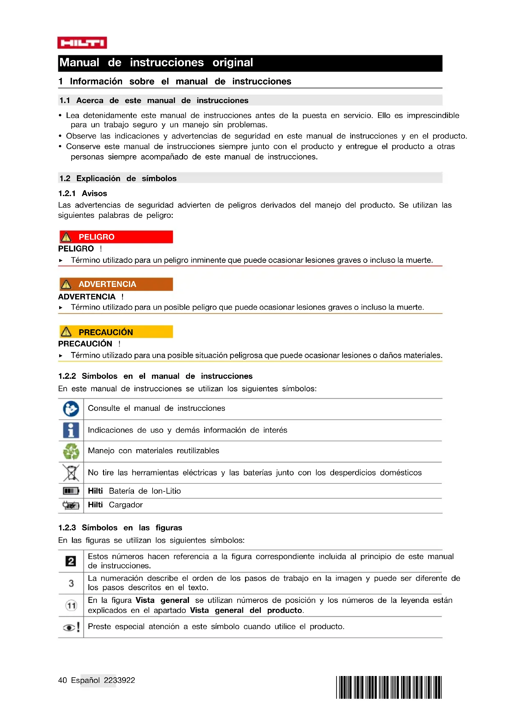 En este manual de instrucciones se utilizan los siguientes símbolos: Consulte el manual de instrucciones Indicaciones de uso y demás información de interés Manejo con materiales reutilizables No tire las herramientas eléctricas y las baterías junto con los desperdicios domésticos Hilti Batería de Ion-Litio Hilti Cargador