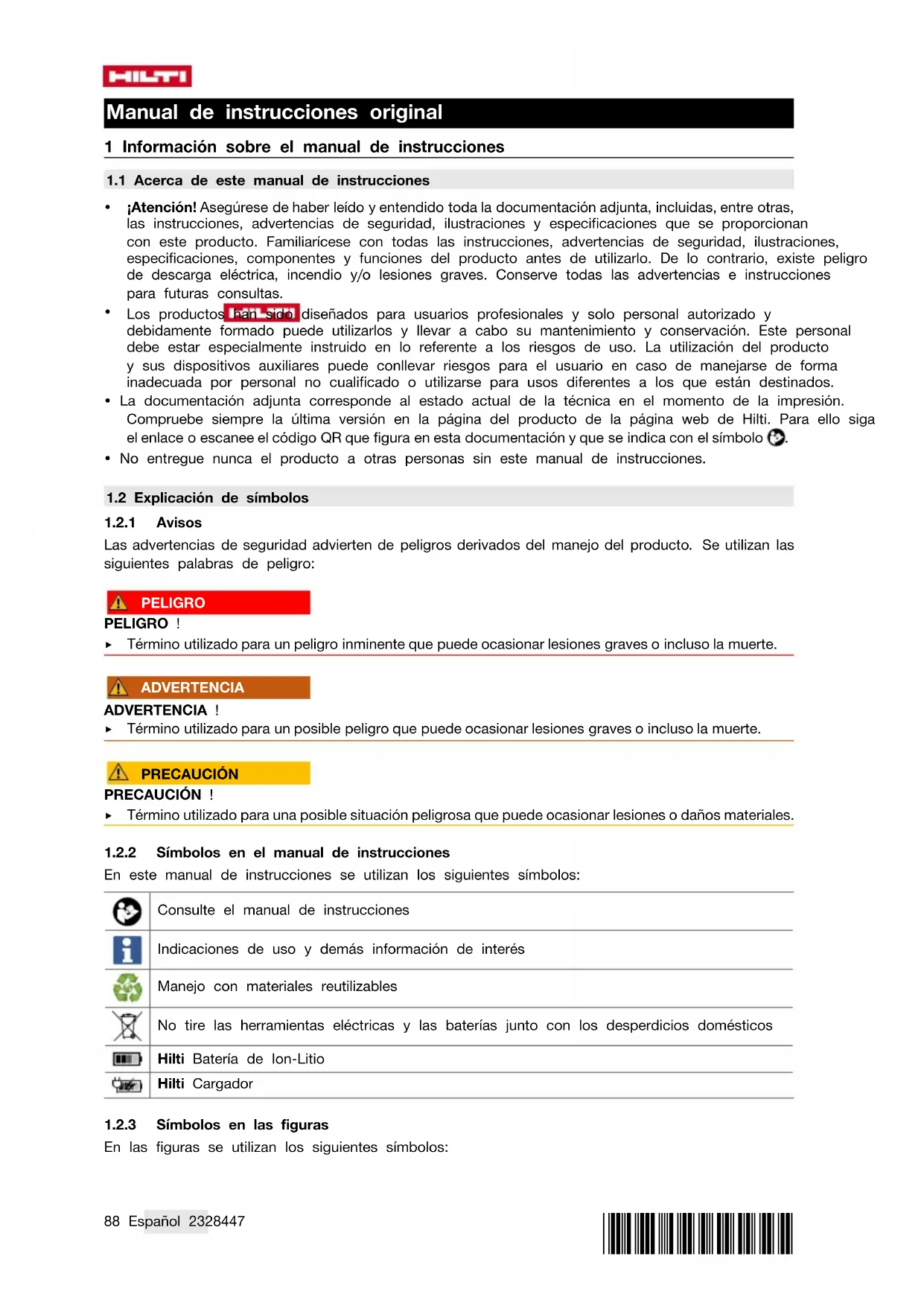 En este manual de instrucciones se utilizan los siguientes símbolos: Consulte el manual de instrucciones Indicaciones de uso y demás información de interés Manejo con materiales reutilizables No tire las herramientas eléctricas y las baterías junto con los desperdicios domésticos Hilti Batería de Ion-Litio Hilti Cargador