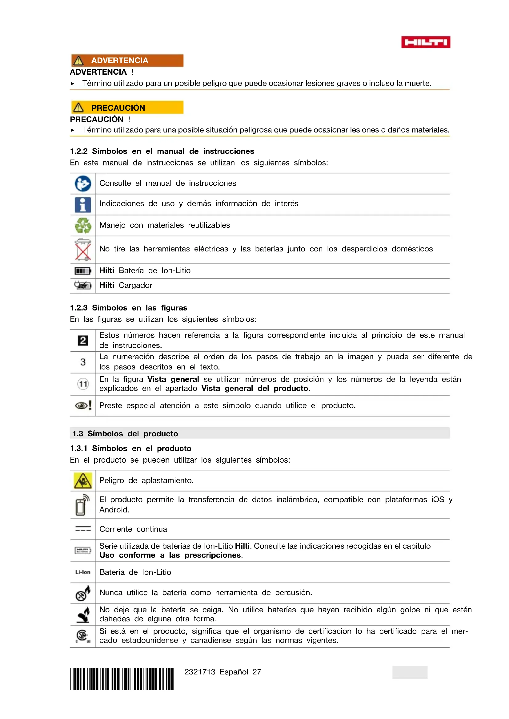En el producto se pueden utilizar los siguientes símbolos: Peligro de aplastamiento. El producto permite la transferencia de datos inalámbrica, compatible con plataformas iOS y Android. Corriente continua Serie utilizada de baterías de Ion-Litio Hilti. Consulte las indicaciones recogidas en el capítulo Uso conforme a las prescripciones. Batería de Ion-Litio Nunca utilice la batería como herramienta de percusión. No deje que la batería se caiga. No utilice baterías que hayan recibido algún golpe ni que estén dañadas de alguna otra forma. Si está en el producto, significa que el organismo de certificación lo ha certificado para el mer- cado estadounidense y canadiense según las normas vigentes.28 Español 2321713 *2321713*