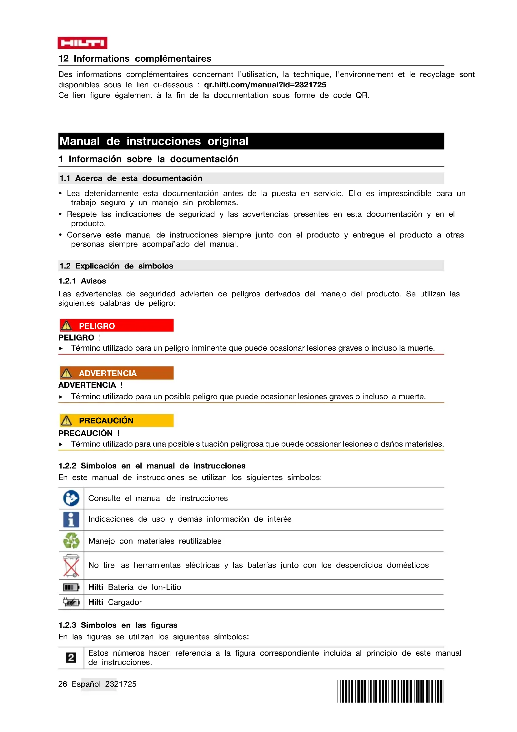 Anomalía Posible causa Solución La batería se descarga con mayor rapidez que de cos- tumbre. Temperatura ambiente demasiado baja. ▶ Deje que la batería se caliente poco a poco hasta alcanzar la temperatura ambiente. La batería no se enclava con un «clic» audible. Suciedad en las lengüetas de la batería. ▶ Limpie las lengüetas y vuelva a colocar la batería. LED rojo => parpadeo largo con tono de advertencia. No se alcanza la presión de com- pactación (error de aplicación). ▶ Preste atención a la aplicación correcta y, en caso necesario, compruebe el prensado. LED rojo => luz continua con tono de advertencia. Problema técnico. ▶ Póngase en contacto con el servicio técnico de Hilti. 10 Reciclaje ADVERTENCIA Riesgo de lesiones por un reciclaje indebido. Riesgo para la salud debido a escapes de gases o líquidos. ▶ No envíe baterías dañadas bajo ningún concepto. ▶ Cubra las conexiones con un material no conductor para evitar cortocircuitos. ▶ Deshágase de las baterías de tal forma que no terminen en manos de niños. ▶ Elimine la batería en su Hilti Store o diríjase a su empresa de desechos. Los productos Hilti están fabricados en su mayor parte con materiales reutilizables. La condición para dicha reutilización es una separación adecuada de los materiales. En muchos países, Hilti recoge las herramientas usadas para su recuperación. Pregunte al Servicio de Atención al Cliente de Hilti o a su asesor de ventas.*2321725* 2321725 Português 39 ▶ No deseche las herramientas eléctricas, los aparatos eléctricos ni las baterías junto con los residuos domésticos. 11 Garantía del fabricante ▶ Si tiene alguna consulta acerca de las condiciones de la garantía, póngase en contacto con su sucursal local de Hilti. 12 Más información Encontrará información adicional sobre manejo, técnica, medio ambiente y reciclaje en el siguiente enlace: qr.hilti.com/manual?id=2321725 Encontrará este enlace también al final de la documentación como código QR. Manual de instruções original 1 Indicações sobre a documentação