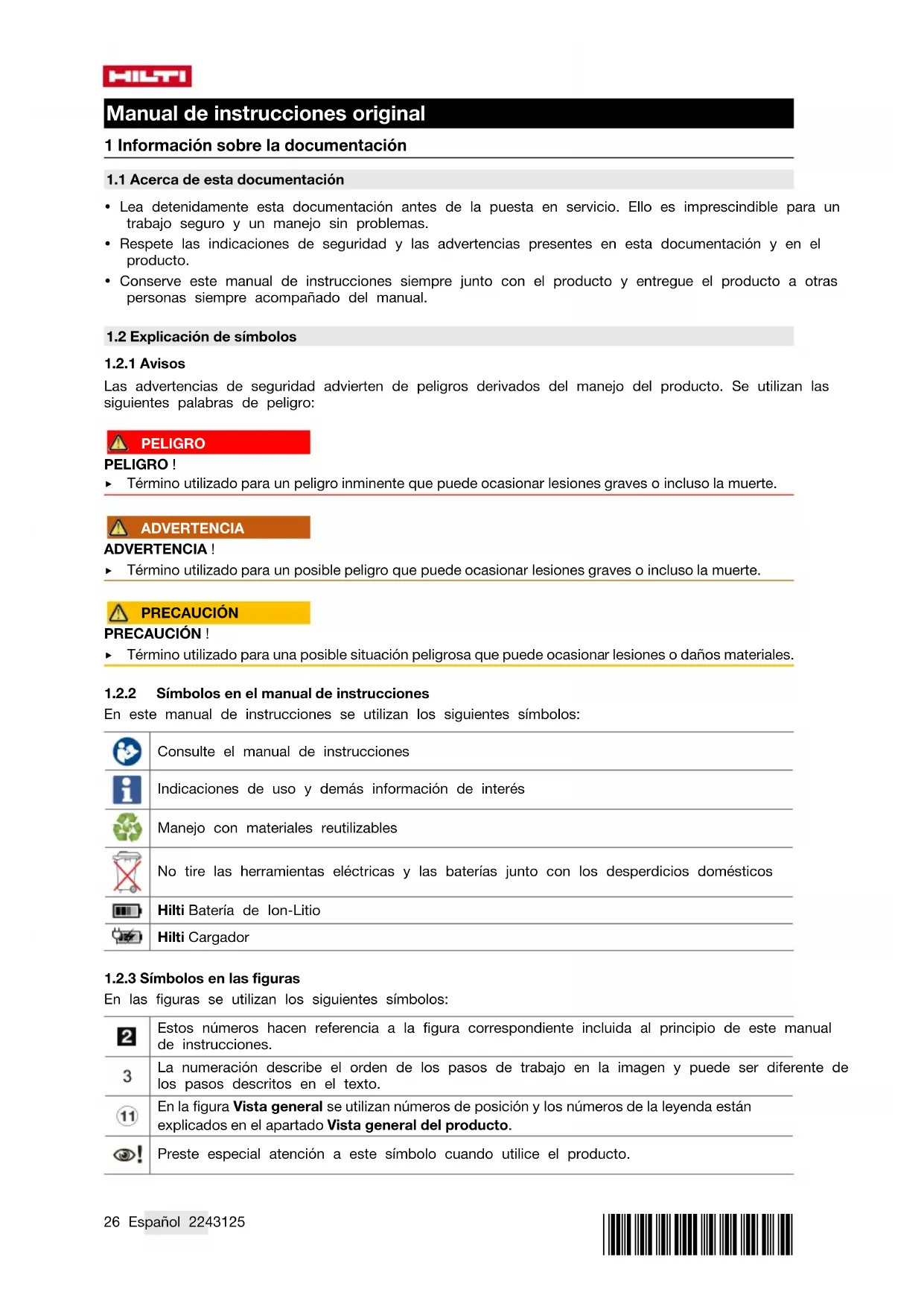 En este manual de instrucciones se utilizan los siguientes símbolos: Consulte el manual de instrucciones Indicaciones de uso y demás información de interés Manejo con materiales reutilizables No tire las herramientas eléctricas y las baterías junto con los desperdicios domésticos Hilti Batería de Ion-Litio Hilti Cargador