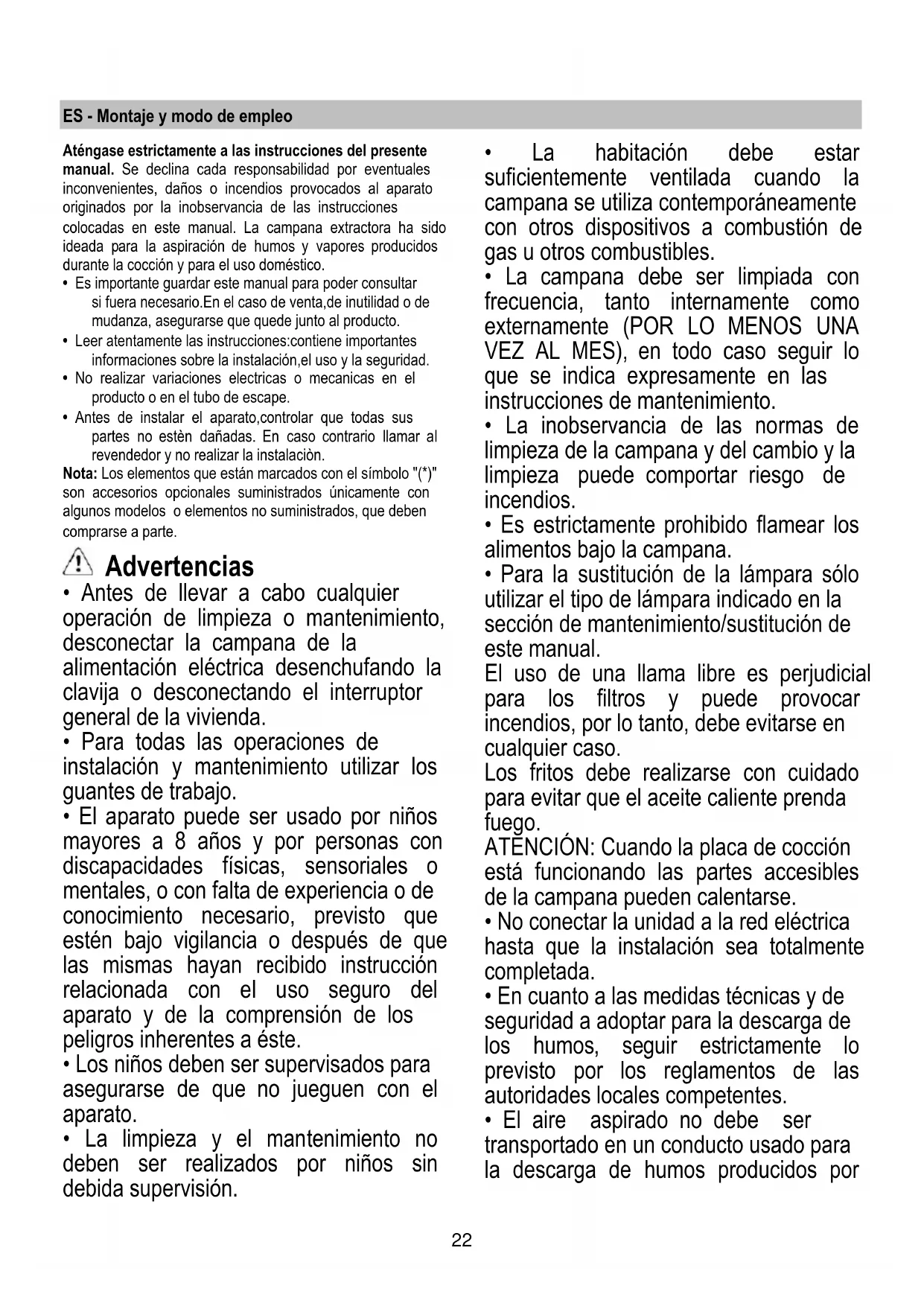 - Para la sustitución de la lámpara sólo utilizar el tipo de lámpara indicado en la sección de mantenimiento/sustitución de este manual. El uso de una llama libre es perjudicial para los filtros y puede provocar incendios, por lo tanto, debe evitarse en cualquier caso. Los fritos debe realizarse con cuidado para evitar que el aceite caliente prenda fuego. ATENCIÓN: Cuando la placa de cocción está funcionando las partes accesibles de la campana pueden calentarse.