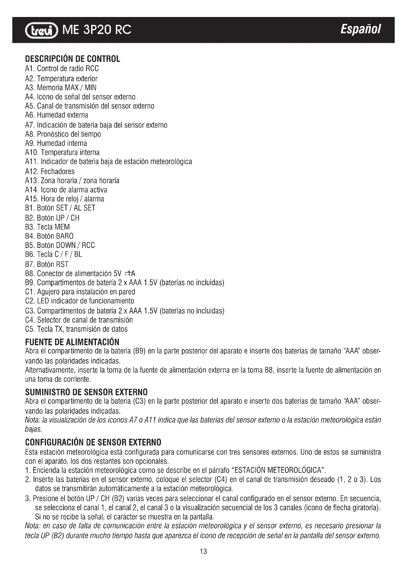 A1. Control de radio RCC A2. Temperatura exterior A3. Memoria MAX / MIN A4. Icono de señal del sensor externo A5. Canal de transmisión del sensor externo A6. Humedad externa A7. Indicación de batería baja del sensor externo A8. Pronóstico del tiempo A9. Humedad interna A10. Temperatura interna A11. Indicador de batería baja de estación meteorológica A12. Fechadores A13. Zona horaria / zona horaria A14. Icono de alarma activa A15. Hora de reloj / alarma B1. Botón SET / AL SET B2. Botón UP / CH B3. Tecla MEM B4. Botón BARO B5. Botón DOWN / RCC B6. Tecla C / F / BL B7. Botón RST B8. Conector de alimentación 5V 1A B9. Compartimentos de batería 2 x AAA 1.5V (baterías no incluidas) C1. Agujero para instalación en pared C2. LED indicador de funcionamiento C3. Compartimentos de batería 2 x AAA 1.5V (baterías no incluidas) C4. Selector de canal de transmisión C5. Tecla TX, transmisión de datos