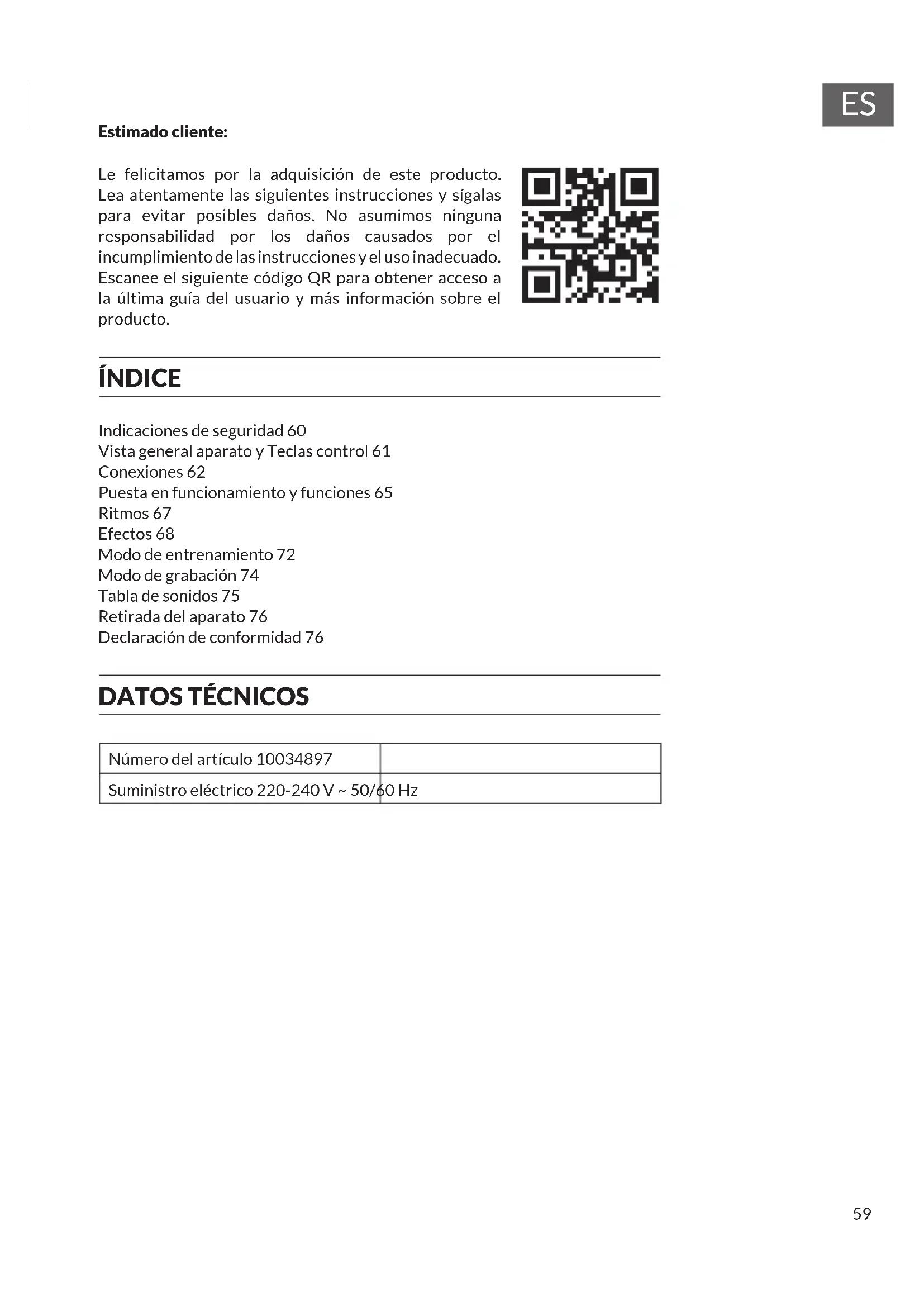 Estimado cliente: Le felicitamos por la adquisición de este producto. Lea atentamente las siguientes instrucciones y sígalas para evitar posibles daños. No asumimos ninguna responsabilidad por los daños causados por el incumplimiento de las instrucciones y el uso inadecuado. Escanee el siguiente código QR para obtener acceso a la última guía del usuario y más información sobre el producto. ÍNDICE Indicaciones de seguridad 60 Vista general aparato y Teclas control 61 Conexiones 62 Puesta en funcionamiento y funciones 65 Ritmos 67 Efectos 68 Modo de entrenamiento 72 Modo de grabación 74 Tabla de sonidos 75 Retirada del aparato 76 Declaración de conformidad 76