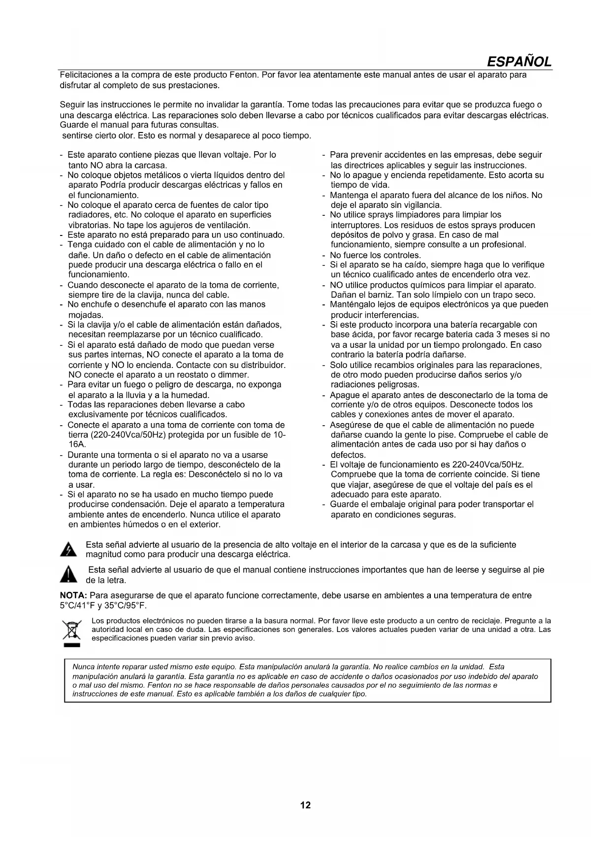 Anschluss Stromadapter 15 Volt DC.12 ESPAÑOL Felicitaciones a la compra de este producto Fenton. Por favor lea atentamente este manual antes de usar el aparato para disfrutar al completo de sus prestaciones. Seguir las instrucciones le permite no invalidar la garantía. Tome todas las precauciones para evitar que se produzca fuego o una descarga eléctrica. Las reparaciones solo deben llevarse a cabo por técnicos cualificados para evitar descargas eléctricas. Guarde el manual para futuras consultas. sentirse cierto olor. Esto es normal y desaparece al poco tiempo. - Este aparato contiene piezas que llevan voltaje. Por lo tanto NO abra la carcasa. - No coloque objetos metálicos o vierta líquidos dentro del aparato Podría producir descargas eléctricas y fallos en el funcionamiento. - No coloque el aparato cerca de fuentes de calor tipo radiadores, etc. No coloque el aparato en superficies vibratorias. No tape los agujeros de ventilación. - Este aparato no está preparado para un uso continuado. - Tenga cuidado con el cable de alimentación y no lo dañe. Un daño o defecto en el cable de alimentación puede producir una descarga eléctrica o fallo en el funcionamiento. - Cuando desconecte el aparato de la toma de corriente, siempre tire de la clavija, nunca del cable. - No enchufe o desenchufe el aparato con las manos mojadas. - Si la clavija y/o el cable de alimentación están dañados, necesitan reemplazarse por un técnico cualificado. - Si el aparato está dañado de modo que puedan verse sus partes internas, NO conecte el aparato a la toma de corriente y NO lo encienda. Contacte con su distribuidor. NO conecte el aparato a un reostato o dimmer. - Para evitar un fuego o peligro de descarga, no exponga el aparato a la lluvia y a la humedad. - Todas las reparaciones deben llevarse a cabo exclusivamente por técnicos cualificados. - Conecte el aparato a una toma de corriente con toma de tierra (220-240Vca/50Hz) protegida por un fusible de 10- 16A. - Durante una tormenta o si el aparato no va a usarse durante un periodo largo de tiempo, desconéctelo de la toma de corriente. La regla es: Desconéctelo si no lo va a usar. - Si el aparato no se ha usado en mucho tiempo puede producirse condensación. Deje el aparato a temperatura ambiente antes de encenderlo. Nunca utilice el aparato en ambientes húmedos o en el exterior. - Para prevenir accidentes en las empresas, debe seguir las directrices aplicables y seguir las instrucciones. - No lo apague y encienda repetidamente. Esto acorta su tiempo de vida. - Mantenga el aparato fuera del alcance de los niños. No deje el aparato sin vigilancia. - No utilice sprays limpiadores para limpiar los interruptores. Los residuos de estos sprays producen depósitos de polvo y grasa. En caso de mal funcionamiento, siempre consulte a un profesional. - No fuerce los controles. - Si el aparato se ha caído, siempre haga que lo verifique un técnico cualificado antes de encenderlo otra vez. - NO utilice productos químicos para limpiar el aparato. Dañan el barniz. Tan solo límpielo con un trapo seco. - Manténgalo lejos de equipos electrónicos ya que pueden producir interferencias. - Si este producto incorpora una batería recargable con base ácida, por favor recarge bateria cada 3 meses si no va a usar la unidad por un tiempo prolongado. En caso contrario la batería podría dañarse. - Solo utilice recambios originales para las reparaciones, de otro modo pueden producirse daños serios y/o radiaciones peligrosas. - Apague el aparato antes de desconectarlo de la toma de corriente y/o de otros equipos. Desconecte todos los cables y conexiones antes de mover el aparato. - Asegúrese de que el cable de alimentación no puede dañarse cuando la gente lo pise. Compruebe el cable de alimentación antes de cada uso por si hay daños o defectos. - El voltaje de funcionamiento es 220-240Vca/50Hz. Compruebe que la toma de corriente coincide. Si tiene que viajar, asegúrese de que el voltaje del país es el adecuado para este aparato. - Guarde el embalaje original para poder transportar el aparato en condiciones seguras. Esta señal advierte al usuario de la presencia de alto voltaje en el interior de la carcasa y que es de la suficiente magnitud como para producir una descarga eléctrica. Esta señal advierte al usuario de que el manual contiene instrucciones importantes que han de leerse y seguirse al pie de la letra. NOTA: Para asegurarse de que el aparato funcione correctamente, debe usarse en ambientes a una temperatura de entre 5°C/41°F y 35°C/95°F. Los productos electrónicos no pueden tirarse a la basura normal. Por favor lleve este producto a un centro de reciclaje. Pregunte a la autoridad local en caso de duda. Las especificaciones son generales. Los valores actuales pueden variar de una unidad a otra. Las especificaciones pueden variar sin previo aviso.