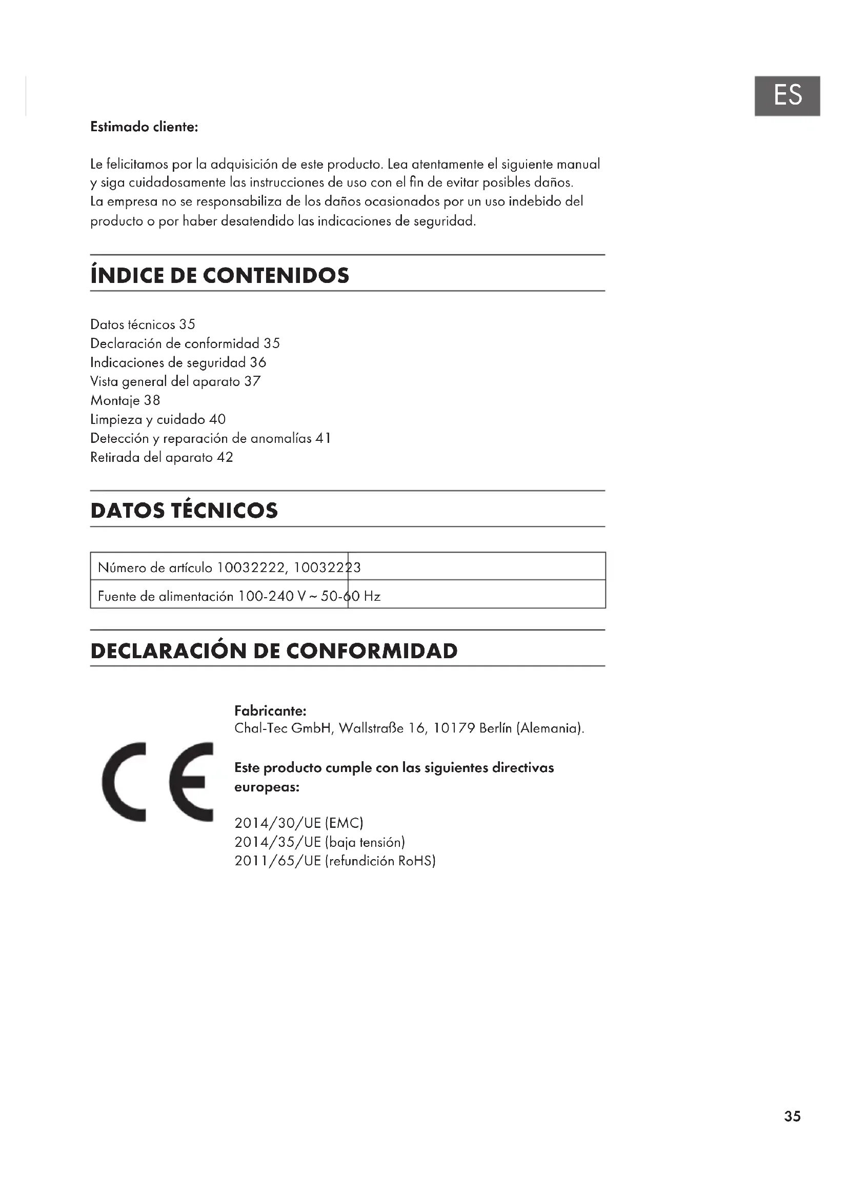 Fabricante: Chal-Tec GmbH, Wallstraße 16, 10179 Berlín (Alemania). Este producto cumple con las siguientes directivas europeas: 2014/30/UE (EMC) 2014/35/UE (baja tensión) 2011/65/UE (refundición RoHS)36