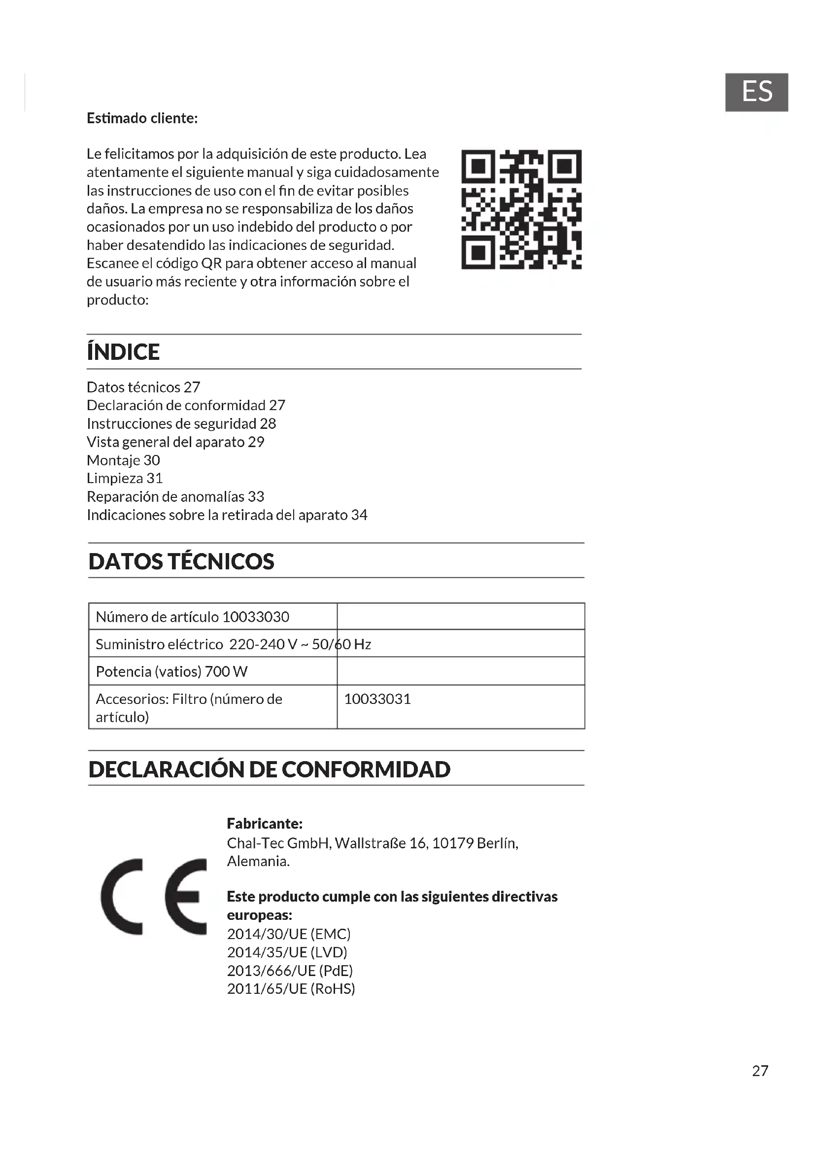 Datos técnicos 27 Declaración de conformidad 27 Instrucciones de seguridad 28 Vista general del aparato 29 Montaje 30 Limpieza 31 Reparación de anomalías 33 Indicaciones sobre la retirada del aparato 34 Esmado cliente: Le felicitamos por la adquisición de este producto. Lea atentamente el siguiente manual y siga cuidadosamente las instrucciones de uso con el n de evitar posibles daños. La empresa no se responsabiliza de los daños ocasionados por un uso indebido del producto o por haber desatendido las indicaciones de seguridad. Escanee el código QR para obtener acceso al manual de usuario más reciente y otra información sobre el producto: ÍNDICE