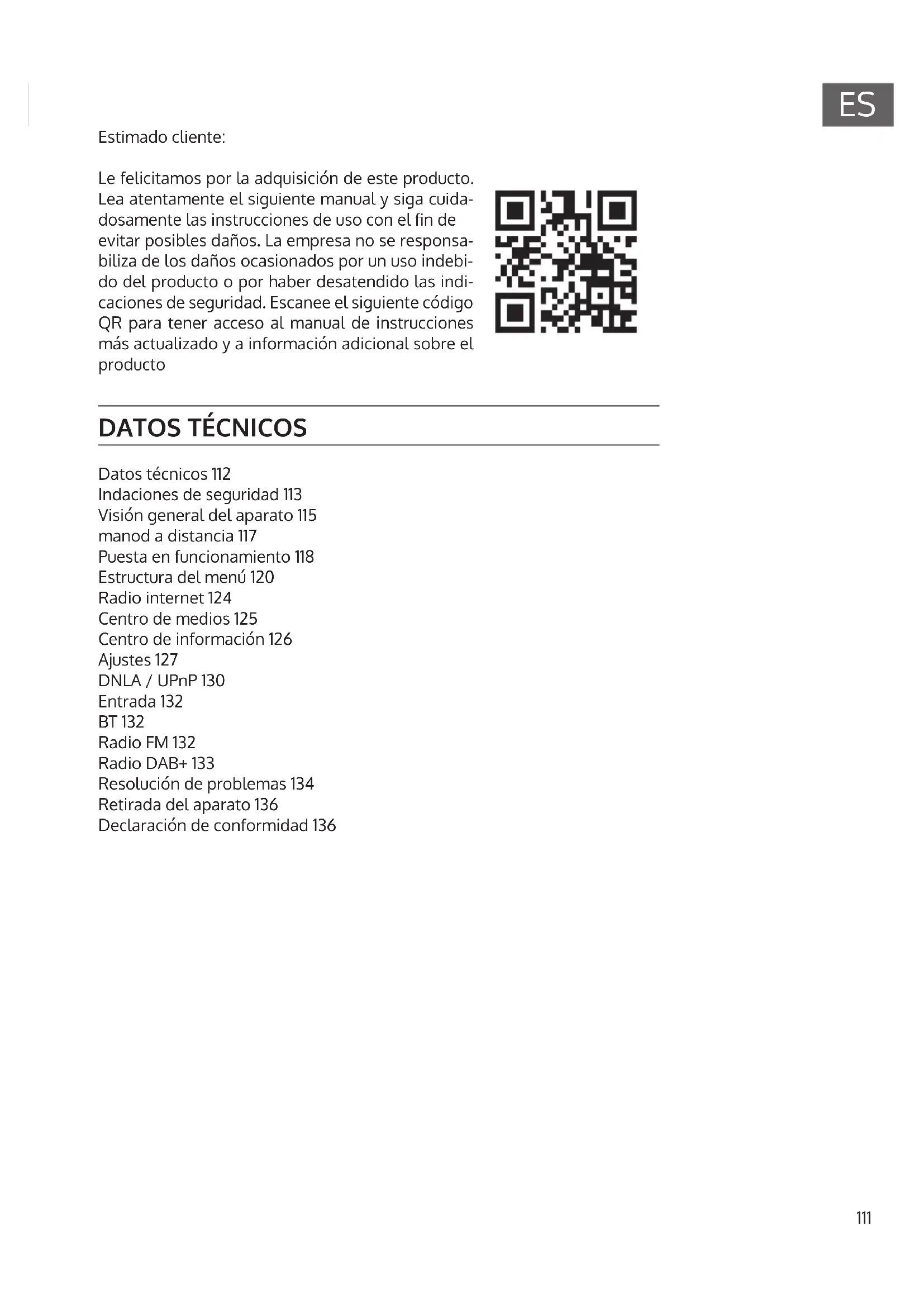 Estimado cliente: Le felicitamos por la adquisición de este producto. Lea atentamente el siguiente manual y siga cuida- dosamente las instrucciones de uso con el n de evitar posibles daños. La empresa no se responsa- biliza de los daños ocasionados por un uso indebi- do del producto o por haber desatendido las indi- caciones de seguridad. Escanee el siguiente código QR para tener acceso al manual de instrucciones más actualizado y a información adicional sobre el producto112