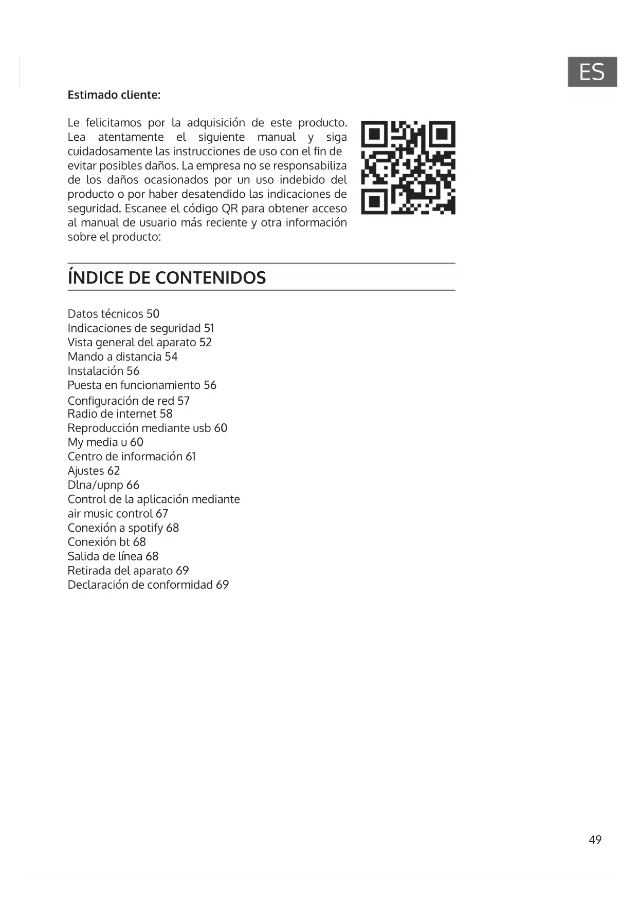 Datos técnicos 50 Indicaciones de seguridad 51 Vista general del aparato 52 Mando a distancia 54 Instalación 56 Puesta en funcionamiento 56 Conguración de red 57 Radio de internet 58 Reproducción mediante usb 60 My media u 60 Centro de información 61 Ajustes 62 Dlna/upnp 66 Control de la aplicación mediante air music control 67 Conexión a spotify 68 Conexión bt 68 Salida de línea 68 Retirada del aparato 69 Declaración de conformidad 6950