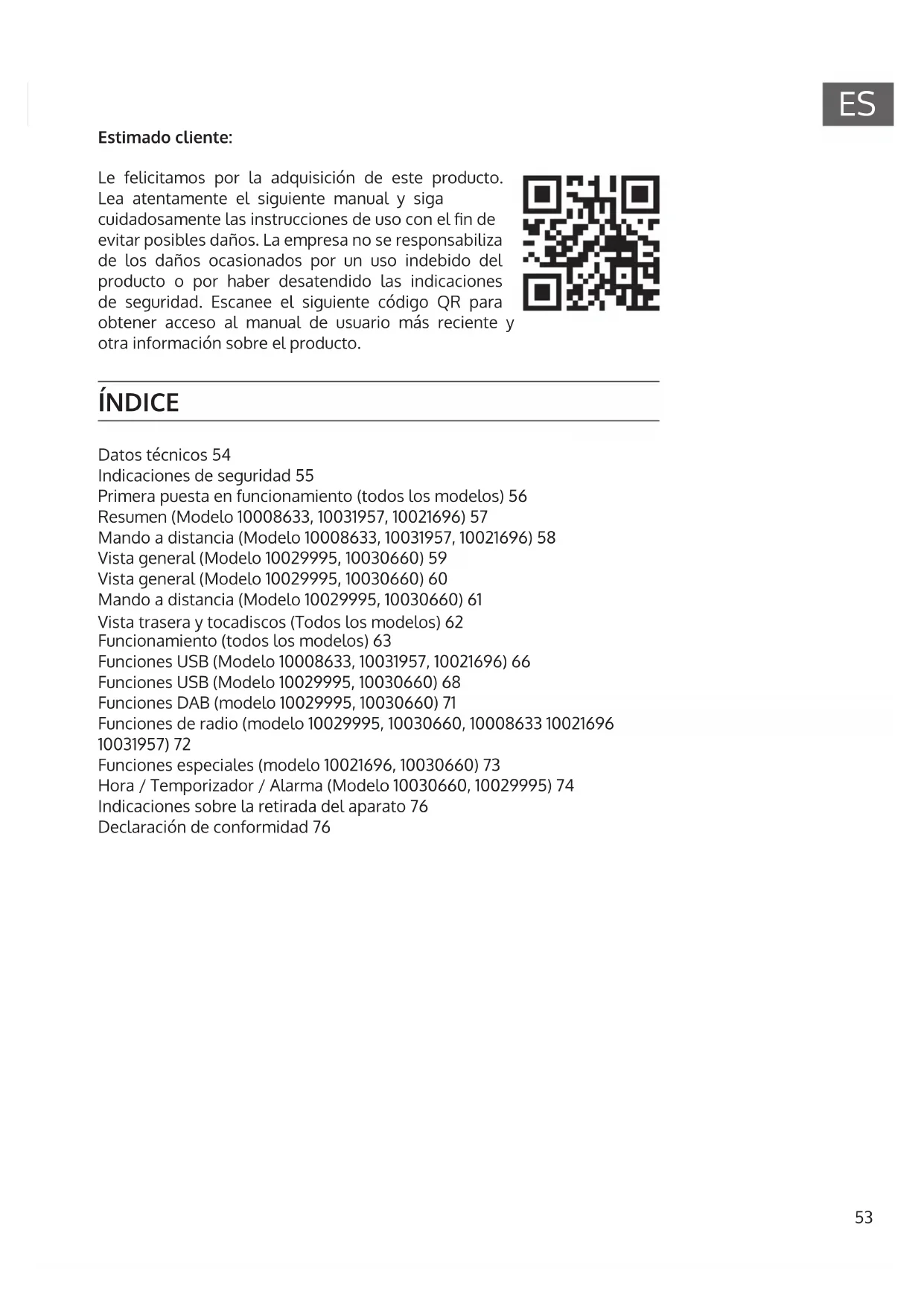 Estimado cliente: Le felicitamos por la adquisición de este producto. Lea atentamente el siguiente manual y siga cuidadosamente las instrucciones de uso con el n de evitar posibles daños. La empresa no se responsabiliza de los daños ocasionados por un uso indebido del producto o por haber desatendido las indicaciones de seguridad. Escanee el siguiente código QR para obtener acceso al manual de usuario más reciente y otra información sobre el producto. ÍNDICE Datos técnicos 54 Indicaciones de seguridad 55 Primera puesta en funcionamiento (todos los modelos) 56 Resumen (Modelo 10008633, 10031957, 10021696) 57 Mando a distancia (Modelo 10008633, 10031957, 10021696) 58 Vista general (Modelo 10029995, 10030660) 59 Vista general (Modelo 10029995, 10030660) 60 Mando a distancia (Modelo 10029995, 10030660) 61 Vista trasera y tocadiscos (Todos los modelos) 62 Funcionamiento (todos los modelos) 63 Funciones USB (Modelo 10008633, 10031957, 10021696) 66 Funciones USB (Modelo 10029995, 10030660) 68 Funciones DAB (modelo 10029995, 10030660) 71 Funciones de radio (modelo 10029995, 10030660, 10008633 10021696 10031957) 72 Funciones especiales (modelo 10021696, 10030660) 73 Hora / Temporizador / Alarma (Modelo 10030660, 10029995) 74 Indicaciones sobre la retirada del aparato 76 Declaración de conformidad 7654