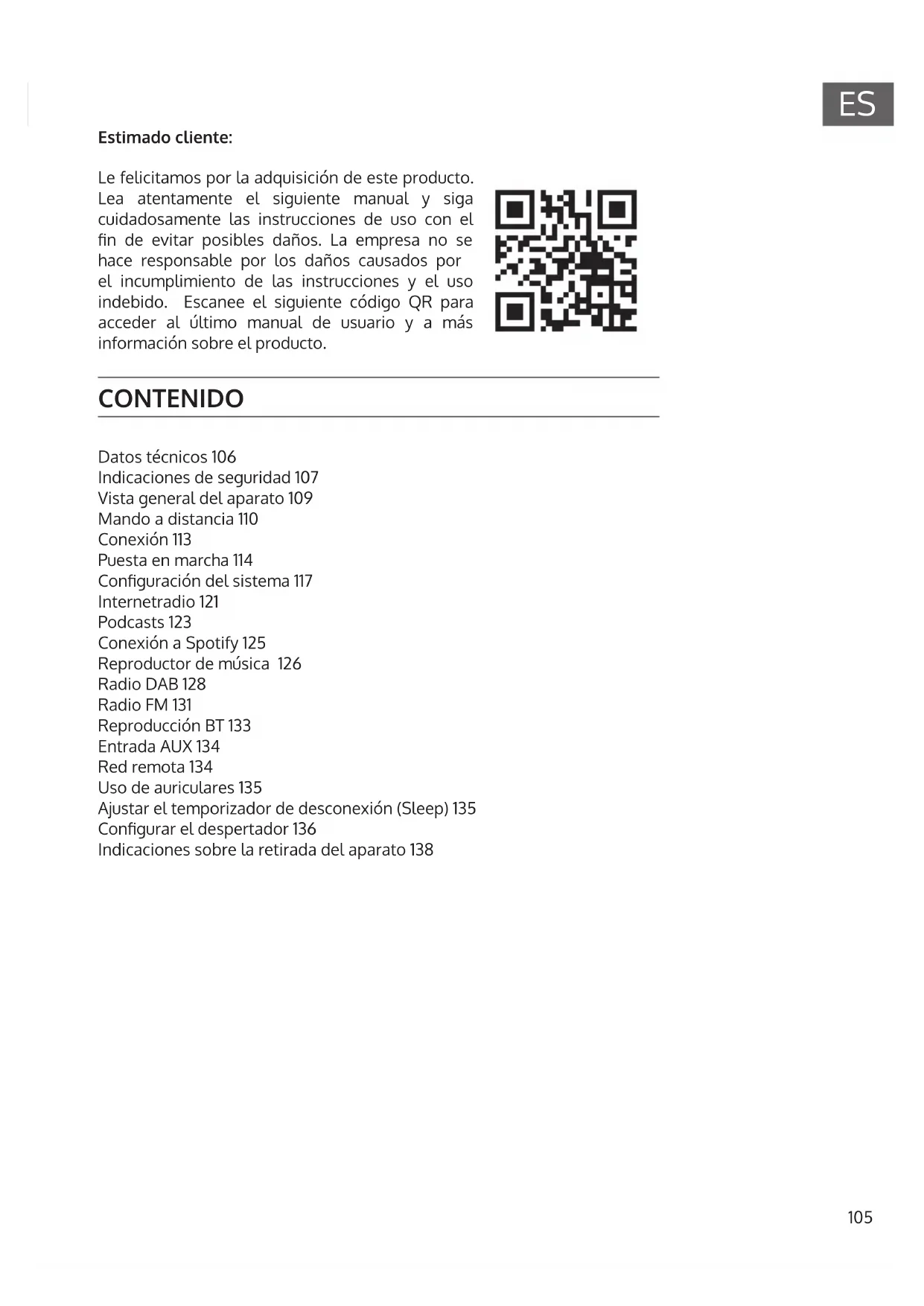 Datos técnicos 106 Indicaciones de seguridad 107 Vista general del aparato 109 Mando a distancia 110 Conexión 113 Puesta en marcha 114 Conguración del sistema 117 Internetradio 121 Podcasts 123 Conexión a Spotify 125 Reproductor de música 126 Radio DAB 128 Radio FM 131 Reproducción BT 133 Entrada AUX 134 Red remota 134 Uso de auriculares 135 Ajustar el temporizador de desconexión (Sleep) 135 Congurar el despertador 136 Indicaciones sobre la retirada del aparato 138 CONTENIDO Estimado cliente: Le felicitamos por la adquisición de este producto. Lea atentamente el siguiente manual y siga cuidadosamente las instrucciones de uso con el n de evitar posibles daños. La empresa no se hace responsable por los daños causados por el incumplimiento de las instrucciones y el uso indebido. Escanee el siguiente código QR para acceder al último manual de usuario y a más información sobre el producto.106