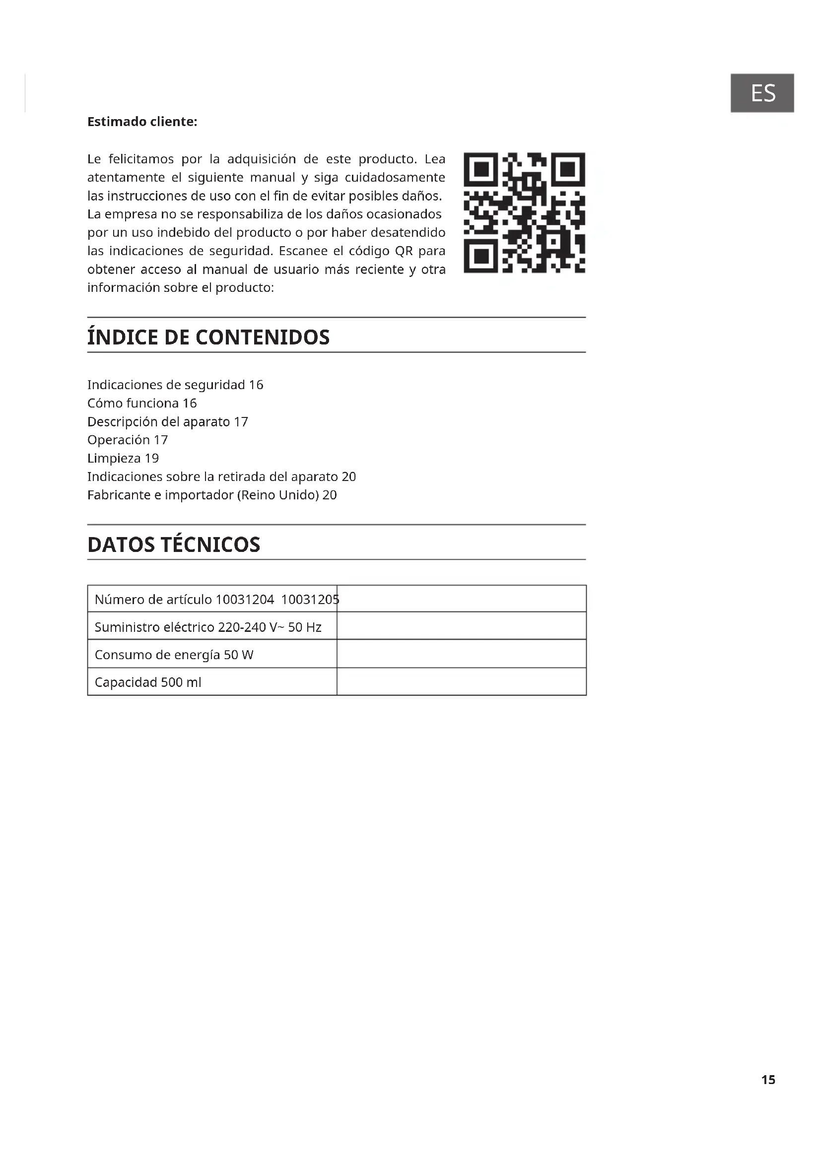 Número de artículo 10031204 10031205 Suministro eléctrico 220-240 V~ 50 Hz Consumo de energía 50 W Capacidad 500 ml16