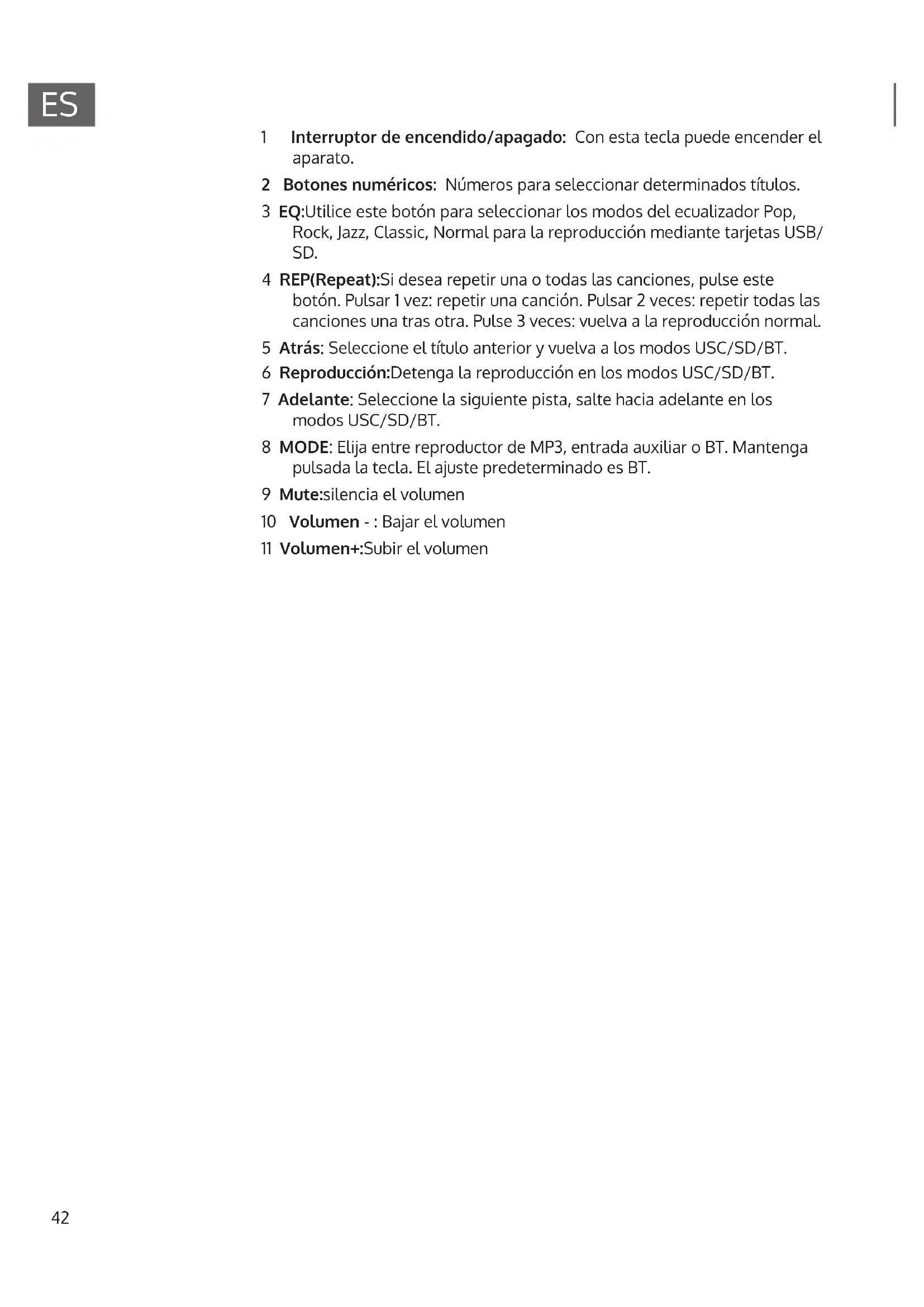 1 Interruptor de encendido/apagado: Con esta tecla puede encender el aparato. 2 Botones numéricos: Números para seleccionar determinados títulos. 3 EQ: Utilice este botón para seleccionar los modos del ecualizador Pop, Rock, Jazz, Classic, Normal para la reproducción mediante tarjetas USB/ SD. 4 REP (Repeat): Si desea repetir una o todas las canciones, pulse este botón. Pulsar 1 vez: repetir una canción. Pulsar 2 veces: repetir todas las canciones una tras otra. Pulse 3 veces: vuelva a la reproducción normal. 5 Atrás: Seleccione el título anterior y vuelva a los modos USC/SD/BT. 6 Reproducción: Detenga la reproducción en los modos USC/SD/BT. 7 Adelante: Seleccione la siguiente pista, salte hacia adelante en los modos USC/SD/BT. 8 MODE: Elija entre reproductor de MP3, entrada auxiliar o BT. Mantenga pulsada la tecla. El ajuste predeterminado es BT. 9 Mute: silencia el volumen 10 Volumen - : Bajar el volumen 11 Volumen +: Subir el volumen43