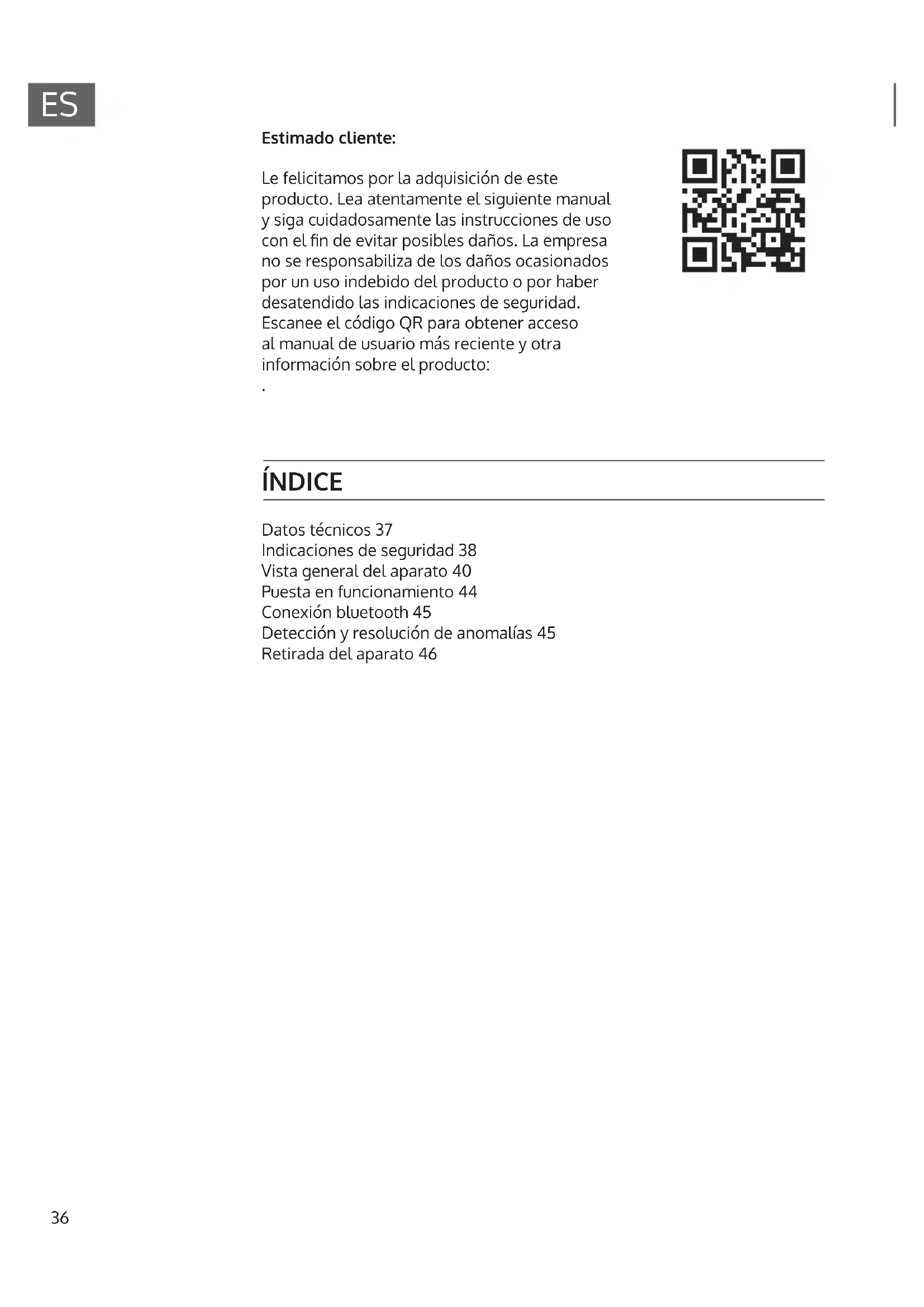 Datos técnicos 37 Indicaciones de seguridad 38 Vista general del aparato 40 Puesta en funcionamiento 44 Conexión bluetooth 45 Detección y resolución de anomalías 45 Retirada del aparato 46 Estimado cliente: Le felicitamos por la adquisición de este producto. Lea atentamente el siguiente manual y siga cuidadosamente las instrucciones de uso con el n de evitar posibles daños. La empresa no se responsabiliza de los daños ocasionados por un uso indebido del producto o por haber desatendido las indicaciones de seguridad. Escanee el código QR para obtener acceso al manual de usuario más reciente y otra información sobre el producto: