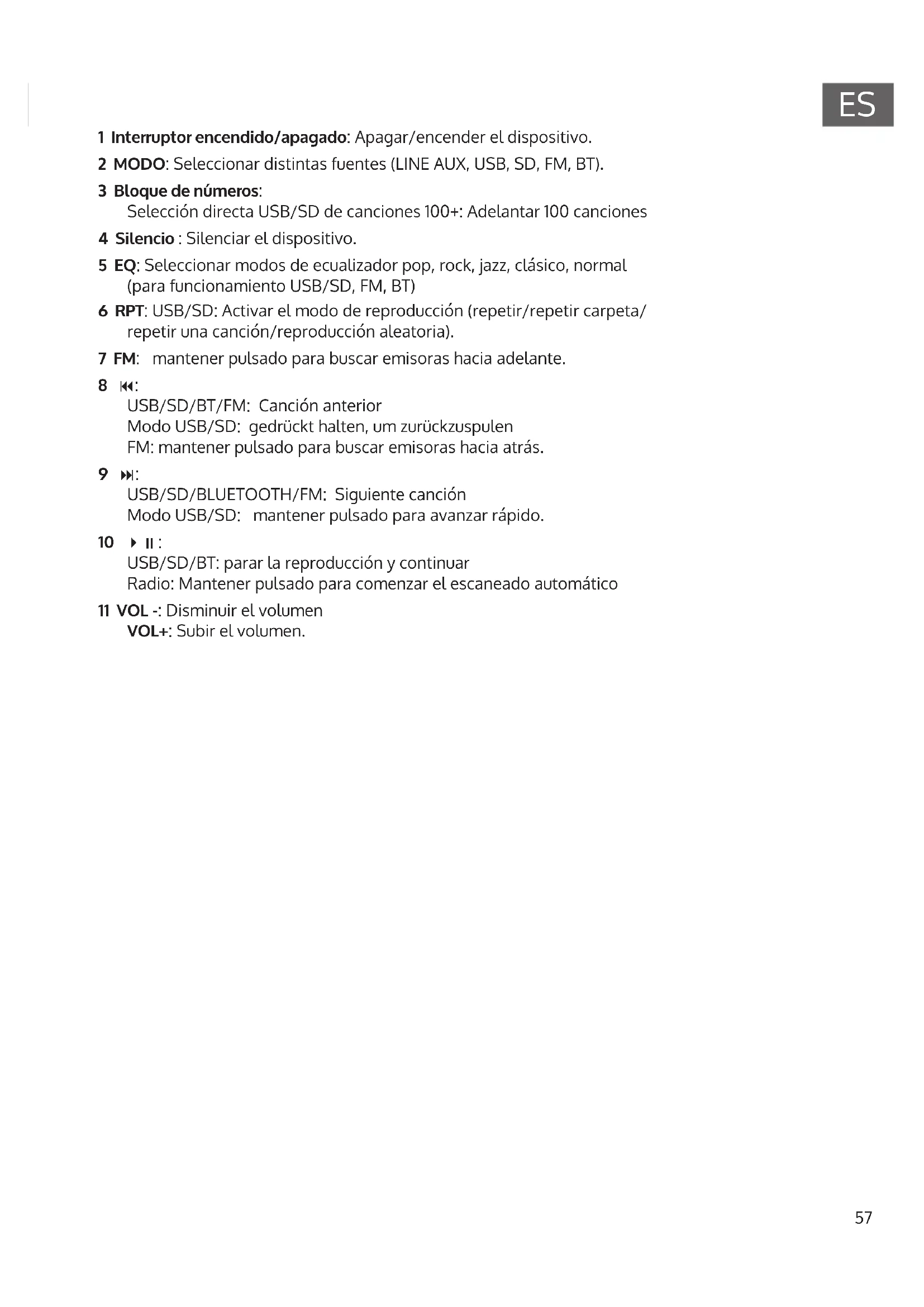 1 Interruptor encendido/apagado: Apagar/encender el dispositivo. 2 MODO: Seleccionar distintas fuentes (LINE AUX, USB, SD, FM, BT). 3 Bloque de números: Selección directa USB/SD de canciones 100+: Adelantar 100 canciones 4 Silencio : Silenciar el dispositivo. 5 EQ: Seleccionar modos de ecualizador pop, rock, jazz, clásico, normal (para funcionamiento USB/SD, FM, BT) 6 RPT: USB/SD: Activar el modo de reproducción (repetir/repetir carpeta/ repetir una canción/reproducción aleatoria). 7 FM: mantener pulsado para buscar emisoras hacia adelante. 8 : USB/SD/BT/FM: Canción anterior Modo USB/SD: gedrückt halten, um zurückzuspulen FM: mantener pulsado para buscar emisoras hacia atrás. 9 : USB/SD/BLUETOOTH/FM: Siguiente canción Modo USB/SD: mantener pulsado para avanzar rápido. 10 : USB/SD/BT: parar la reproducción y continuar Radio: Mantener pulsado para comenzar el escaneado automático 11 VOL -: Disminuir el volumen VOL+: Subir el volumen.58