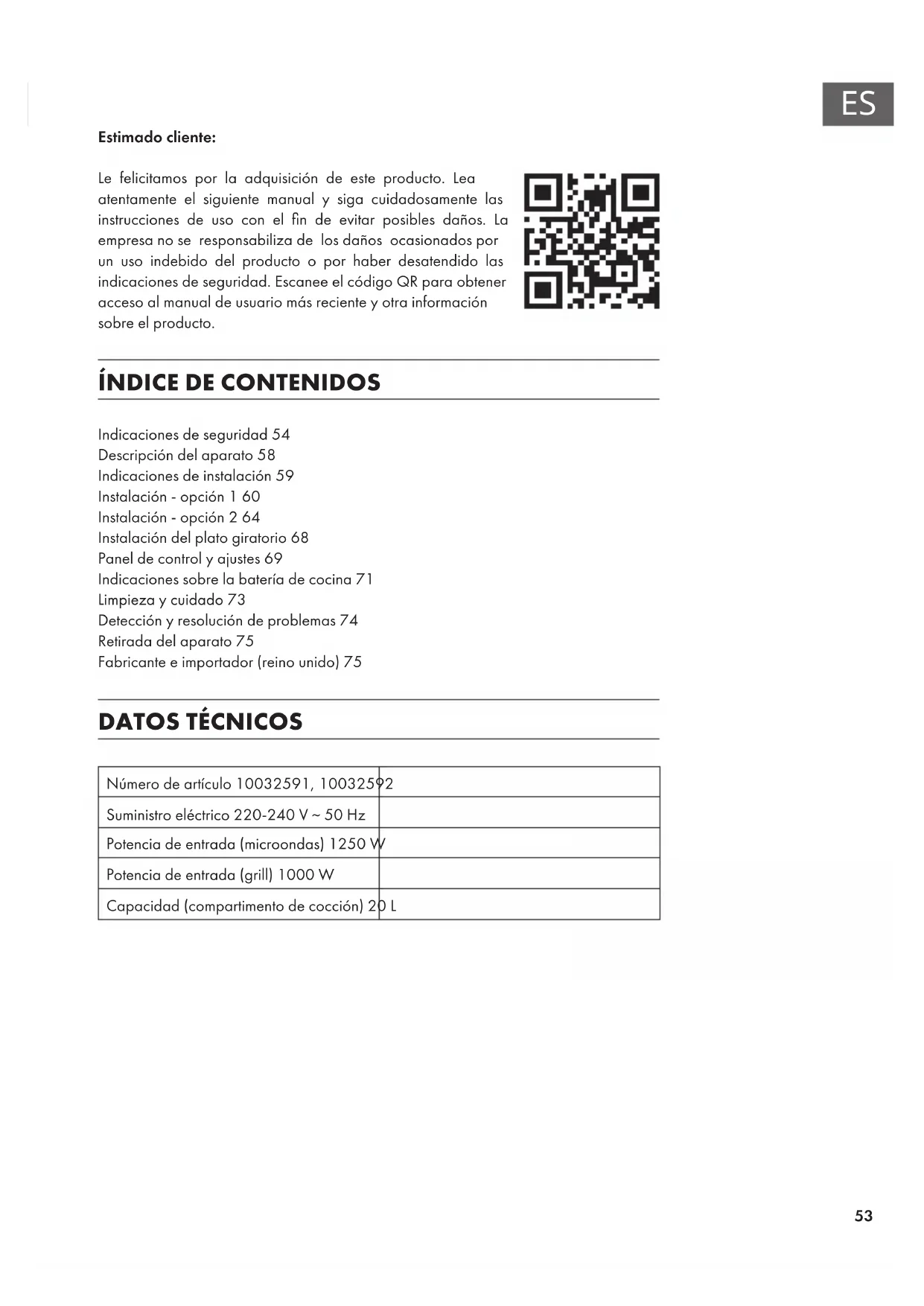Indicaciones de seguridad54 Descripción del aparato58 Indicaciones de instalación59 Instalación - opción 160 Instalación - opción 264 Instalación del plato giratorio68 Panel de control y ajustes69 Indicaciones sobre la batería de cocina71 Limpieza y cuidado73 Detección y resolución de problemas74 Retirada del aparato75 Fabricante e importador (reino unido)75