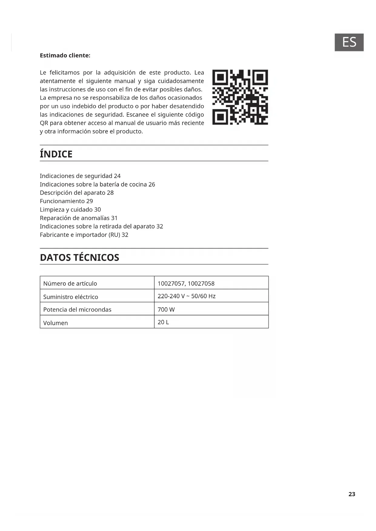 Estimado cliente: Le felicitamos por la adquisición de este producto. Lea atentamente el siguiente manual y siga cuidadosamente las instrucciones de uso con el n de evitar posibles daños. La empresa no se responsabiliza de los daños ocasionados por un uso indebido del producto o por haber desatendido las indicaciones de seguridad. Escanee el siguiente código QR para obtener acceso al manual de usuario más reciente y otra información sobre el producto. ÍNDICE Indicaciones de seguridad 24 Indicaciones sobre la batería de cocina 26 Descripción del aparato 28 Funcionamiento 29 Limpieza y cuidado 30 Reparación de anomalías 31 Indicaciones sobre la retirada del aparato 32 Fabricante e importador (RU) 32