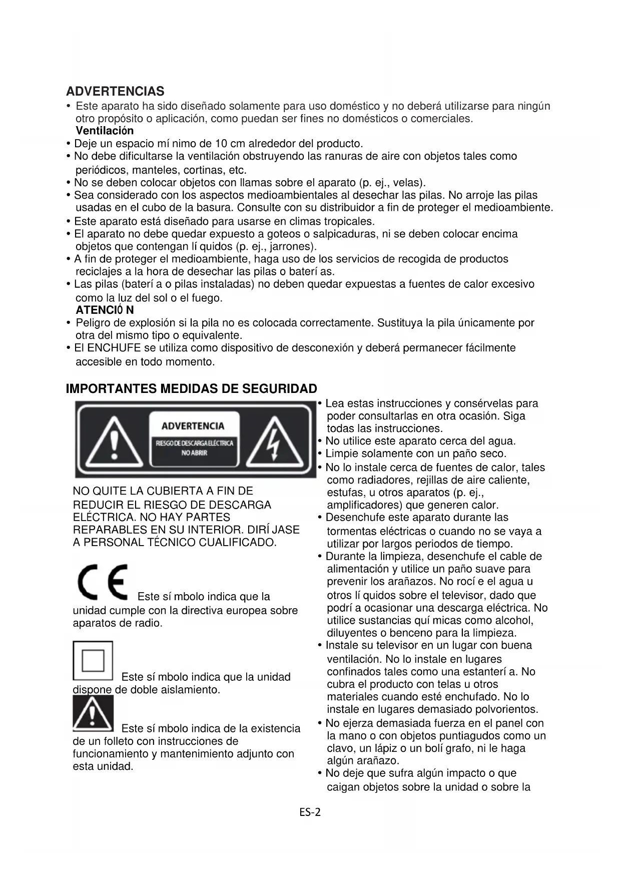 A PERSONAL TÉCNICO CUALIFICADO. Este símbolo indica que la unidad cumple con la directiva europea sobre aparatos de radio. Este símbolo indica que la unidad dispone de doble aislamiento. Este símbolo indica de la existencia de un folleto con instrucciones de funcionamiento y mantenimiento adjunto con esta unidad. Lea estas instrucciones y consérvelas para poder consultarlas en otra ocasión. Siga todas las instrucciones. No utilice este aparato cerca del agua. Limpie solamente con un paño seco. No lo instale cerca de fuentes de calor, tales como radiadores, rejillas de aire caliente, estufas, u otros aparatos (p. ej., amplificadores) que generen calor. Desenchufe este aparato durante las tormentas eléctricas o cuando no se vaya a utilizar por largos periodos de tiempo. Durante la limpieza, desenchufe el cable de alimentación y utilice un paño suave para prevenir los arañazos. No rocíe el agua u otros líquidos sobre el televisor, dado que podría ocasionar una descarga eléctrica. No utilice sustancias químicas como alcohol, diluyentes o benceno para la limpieza. Instale su televisor en un lugar con buena ventilación. No lo instale en lugares confinados tales como una estantería. No cubra el producto con telas u otros materiales cuando esté enchufado. No lo instale en lugares demasiado polvorientos. No ejerza demasiada fuerza en el panel con la mano o con objetos puntiagudos como un clavo, un lápiz o un bolígrafo, ni le haga algún arañazo. No deje que sufra algún impacto o que caigan objetos sobre la unidad o sobre laES-3 Este símbolo indica del riesgo de electrocución debido a la presencia de voltajes peligrosos en el interior de esta unidad. pantalla.