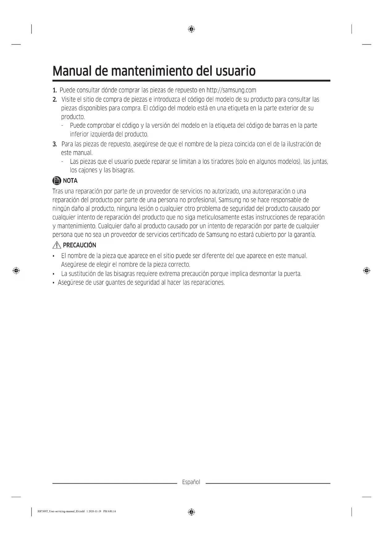 - Asegúrese de usar guantes de seguridad al hacer las reparaciones. RB7300T_User-servicing-manual_ES.indd 1 2020-11-19 PM 6:01:14Español La imagen real y las piezas proporcionadas con el frigoríco pueden variar en función del modelo y del país.