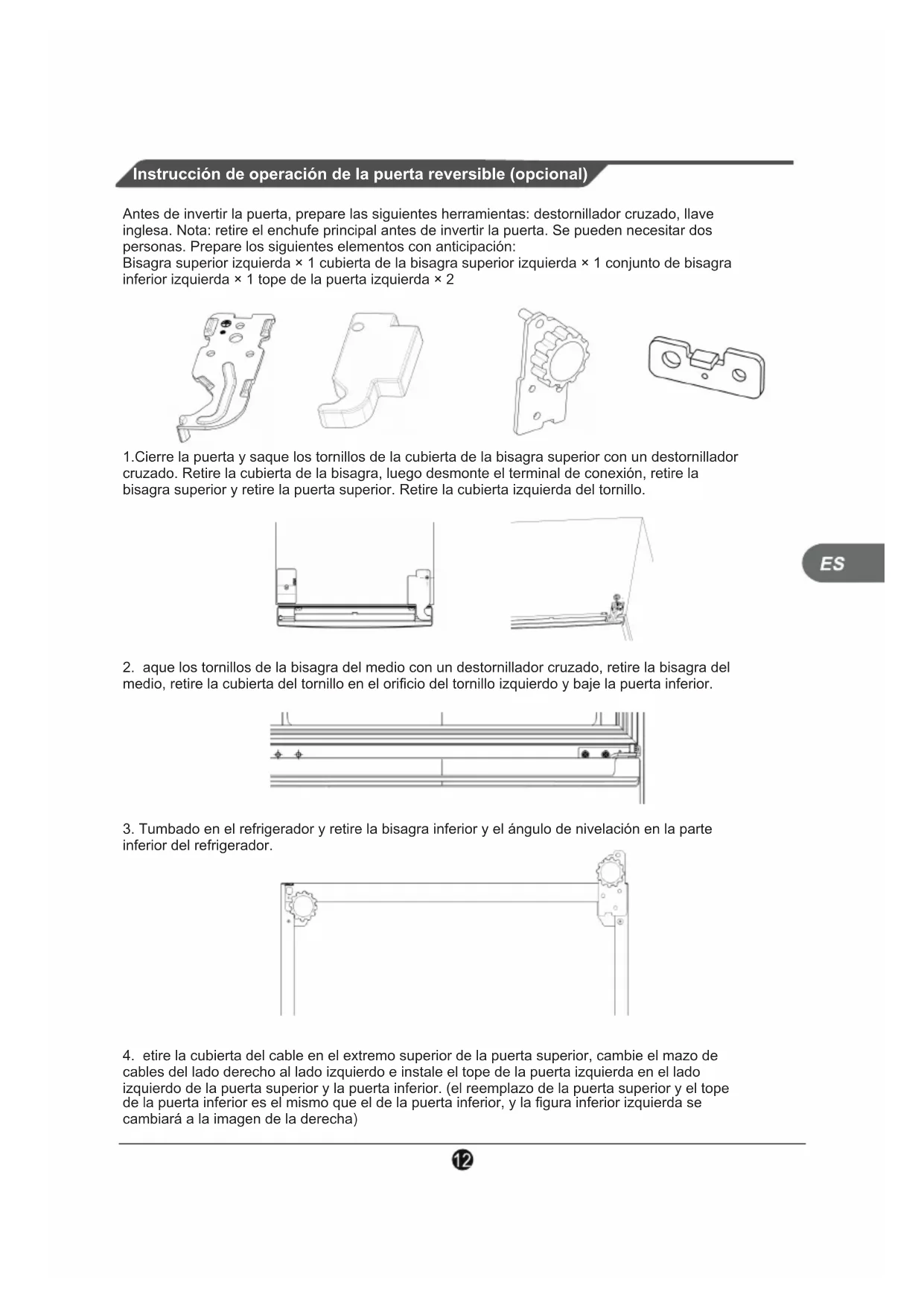 cables del lado derecho al lado izquierdo e instale el tope de la puerta izquierda en el lado izquierdo de la puerta superior y la puerta inferior. (el reemplazo de la puerta superior y el tope de la puerta inferior es el mismo que el de la puerta inferior, y la figura inferior izquierda se cambiará a la imagen de la derecha)Instrucción de operación de la puerta reversible (opcional) 5.Instale el conjunto de bisagra inferior izquierda previamente preparado a la izquierda, instale el ángulo de nivelación previamente retirado a la derecha e instale la puerta inferior. 6.Instale la bisagra del medio en la posición de montaje izquierda e instale la cubierta del tornillo que retiró anteriormente en el orificio del tornillo derecho. 7.Instale la puerta superior, conecte los terminales, instale la bisagra superior izquierda, la cubierta de la bisagra superior izquierda y la cubierta del tornillo que retiró anteriormente. Puerta de marcha atrás completa. (la bisagra superior y la cubierta de la bisagra están instaladas a la izquierda como se muestra en la figura, y la cubierta del tornillo está en la posición correcta)