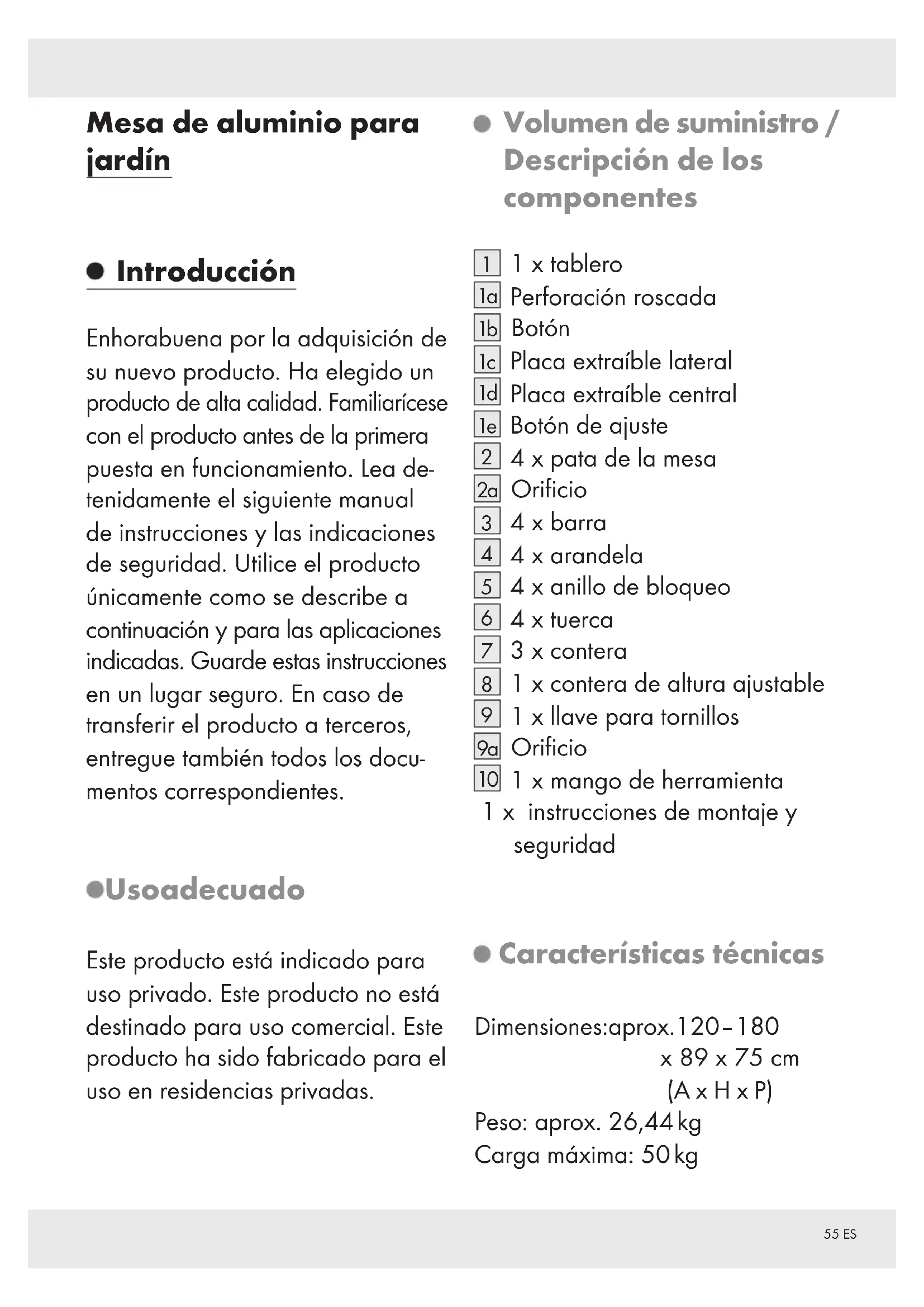 1 x mango de herramienta 1 x instrucciones de montaje y seguridad Características técnicas Dimensiones: aprox. 120‒180 x 89 x 75 cm (A x H x P) Peso: aprox. 26,44 kg Carga máxima: 50 kg56 ES Indicaciones sobre seguridad