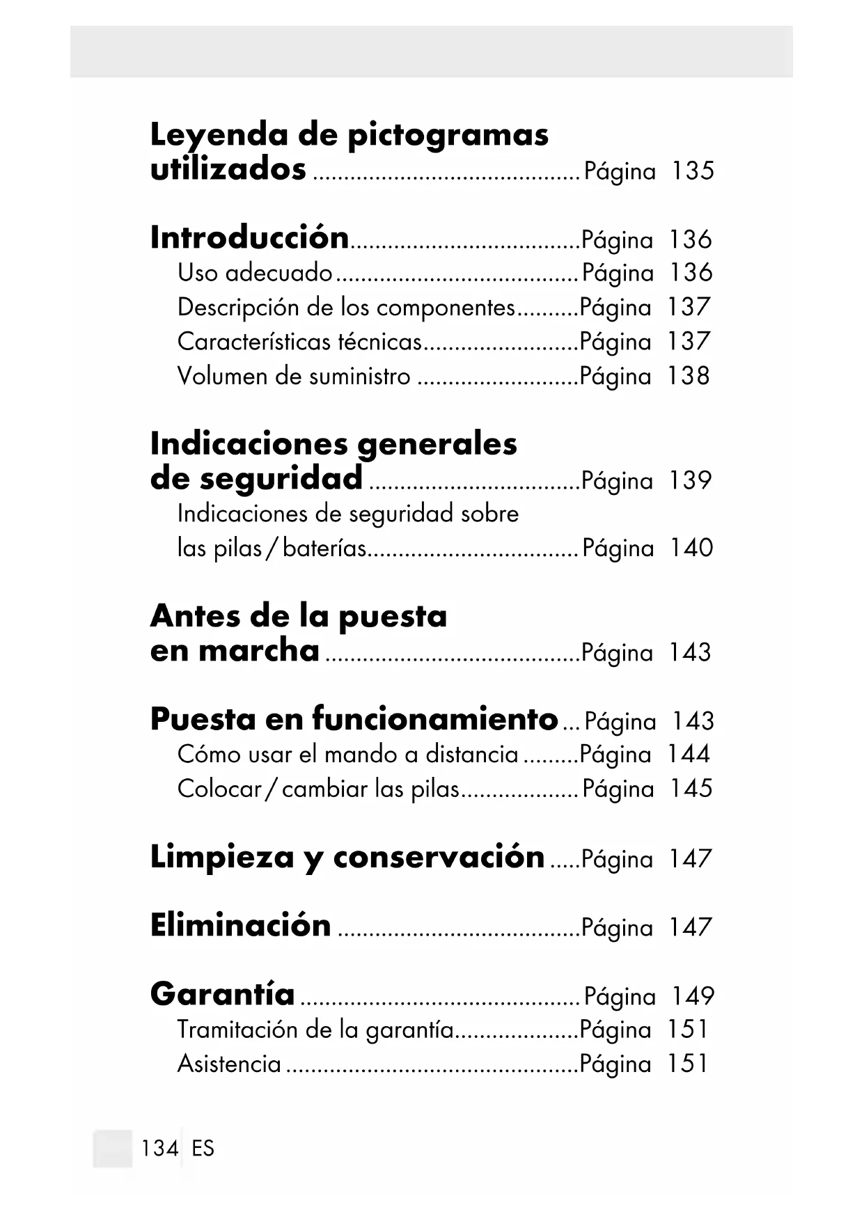 con un plumero. ¡No los sumerja en agua! Después de la limpieza, vuelva a colocar las pilas. Eliminación El embalaje está compuesto por materiales no contaminantes que pueden ser desechados en el centro de reciclaje local.