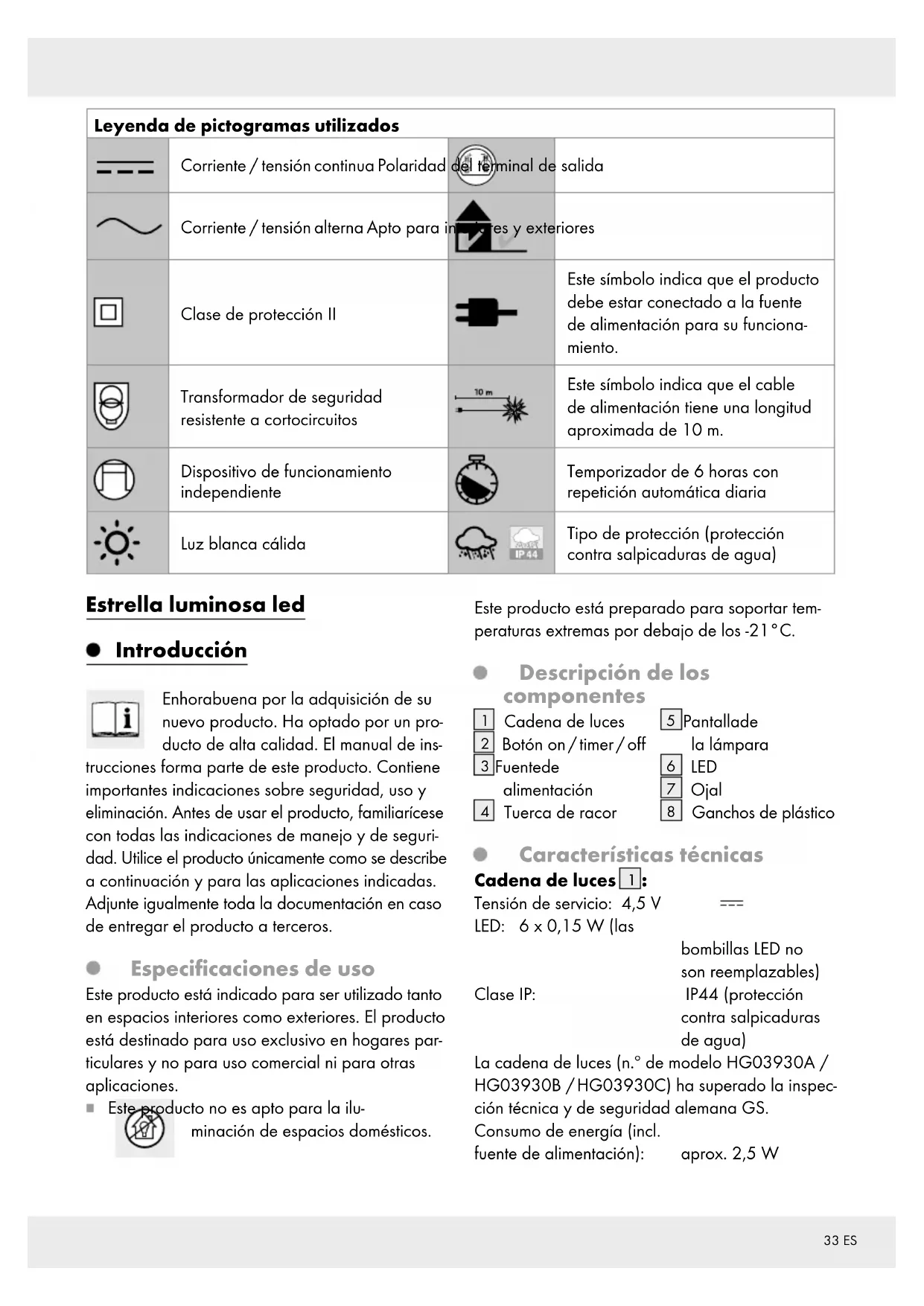 Tenga en cuenta el distintivo del emba- laje para la separación de residuos. Está compuesto por abreviaturas (a) y números (b) que significan lo siguiente:36 ES 1–7: plásticos / 20–22: papel y car- tón / 80–98: materiales compuestos. El producto y el material de embalaje son reciclables. Separe los materiales para un mejor tratamiento de los resi- duos. El logotipo Triman se aplica solo para Francia. Para obtener información sobre las posibilidades de desecho del producto al final de su vida útil, acuda a la admi- nistración de su comunidad o ciudad. Para proteger el medio ambiente no tire el producto junto con la basura domés- tica cuando ya no le sea útil. Deséchelo en un contenedor de reciclaje. Diríjase a la administración competente para obte- ner información sobre los puntos de recogida de residuos y sus horarios. Tramitación de la garantía Para garantizar una rápida tramitación de su con- sulta, tenga en cuenta las siguientes indicaciones: Para realizar cualquier consulta, tenga a mano el recibo y el número de artículo (por ej. IAN 123456_7890) como justificante de compra. Encontrará el número de artículo en una inscripción de la placa indentificativa, en la portada de las instrucciones (abajo a la izquierda) o en una pe- gatina en la parte posterior o inferior. Si el producto fallase o presentase algún defecto, póngase primero en contacto con el departamento de asistencia indicado, ya sea por teléfono o correo electrónico. Puede enviarnos el producto defectuoso libre de franqueo adjuntando el recibo de compra (tícket de compra) e indicando dónde está y cuándo ha ocurrido el fallo a la dirección de asistencia que le indicamos. Asistencia Asistencia en España Tel.: 900984948 E-Mail: owim@lidl.es37 DK De anvendte piktogrammers legende Jævnstrøm / -spænding Udgangtilslutningens polaritet Vekselstrøm / -spænding Til inden- og udendørs brug Beskyttelsesklasse II Dette symbol viser, at produktet for drift skal være tilsluttet strømnettet. Kortslutningssikker sikkerhedstransformator Dette symbol viser, at netkablet er ca. 10 m langt. Uafhængigt driftsapparat 6-timers-timer med automatisk gentagelse i dagsrytmen Varmt hvidt lys Beskyttelsestype (sprøjtevandsbeskyttet) LED-stjerne Indledning Hjerteligt tillykke med købet af deres nye produkt. Du har besluttet dig for et pro- dukt af høj kvalitet. Brugervejledningen er en del af dette produkt. Den indeholder vigtige informationer om sikkerhed, brug og bortskaffelse. Gør dig inden ibrugtagning af produktet fortrolig med alle betjenings- og sikkerhedsanvisninger. Be- nyt kun produktet som beskrevet og til de oplyste formål. Videregiv alle papirer, hvis du giver pro- duktet videre til tredjemand. Formålsbestemt anvendelse Dette produkt er egnet til både inden- og udendørs brug. Produktet er udelukkende beregnet til brug i private hjem og ikke til erhvervsmæssig brug eller til brug i andre sammenhænge. Dette produkt er ikke egnet til rum- belysning i hjemmet. Dette produkt egner sig til ekstreme temperaturer ned til -21°C. Beskrivelse af de enkelte dele