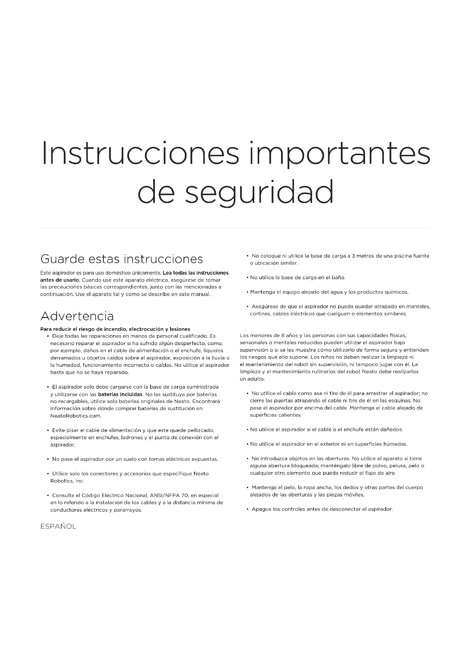 - El aspirador solo debe cargarse con la base de carga suministrada y utilizarse con las baterías incluidas. No las sustituya por baterías no recargables, utilice solo baterías originales de Neato. Encontrará información sobre dónde comprar baterías de sustitución en NeatoRobotics.com.