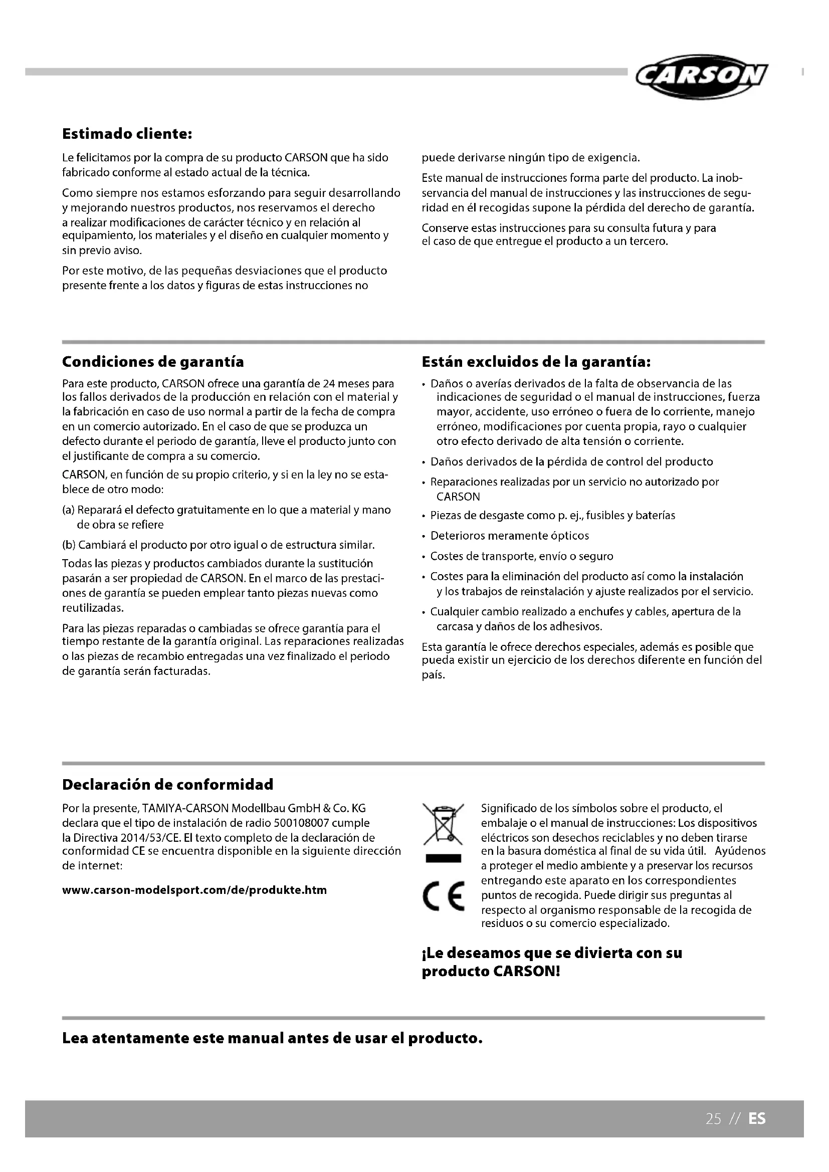 - Cualquier cambio realizado a enchufes y cables, apertura de la carcasa y daños de los adhesivos. Esta garantía le ofrece derechos especiales, además es posible que pueda existir un ejercicio de los derechos diferente en función del país. Lea atentamente este manual antes de usar el producto. Por la presente, TAMIYA-CARSON Modellbau GmbH & Co. KG declara que el tipo de instalación de radio 500108007 cumple la Directiva 2014/53/CE. El texto completo de la declaración de conformidad CE se encuentra disponible en la siguiente dirección de internet: www.carson-modelsport.com/de/produkte.htm Significado de los símbolos sobre el producto, el embalaje o el manual de instrucciones: Los dispositivos eléctricos son desechos reciclables y no deben tirarse en la basura doméstica al final de su vida útil. Ayúdenos a proteger el medio ambiente y a preservar los recursos entregando este aparato en los correspondientes puntos de recogida. Puede dirigir sus preguntas al respecto al organismo responsable de la recogida de residuos o su comercio especializado. ¡Le deseamos que se divierta con su producto CARSON! Declaración de conformidadES // 26