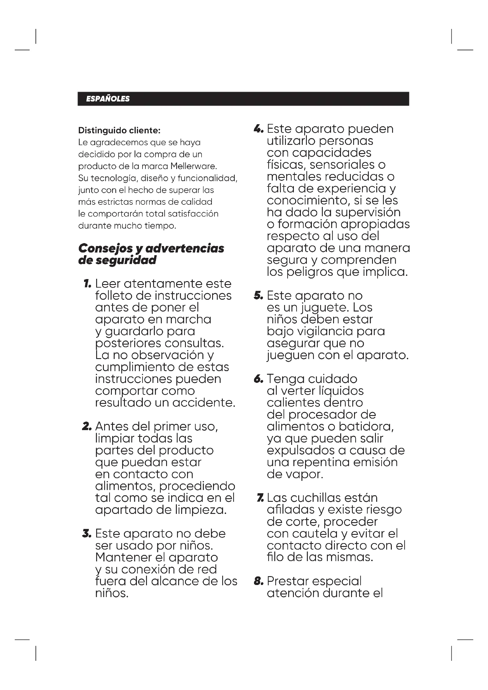 The product does not contain concentrations of substances that could be considered harmful to the environment. - This symbol means that in case you wish to dispose of the product once its working life has ended; take it to an authorised waste agent for the selective collection of Waste from Electric and Electronic Equipment (WEEE). This appliance complies with Directive 2014/35/EU on Low Voltage, Directive 2014/30/EU on Electromagnetic Compatibility, Directive 2011/65/EU on the restrictions of the use of certain hazardous substances in electrical and electronic equipment and Directive 2009/125/EC on the ecodesign requirements for energy-related products. Warranty and technical assistance This product enjoys the recognition and protection bof the legal guarantee in accordance with current legislation. To enforce your rights or interests you must go to any of our o cial technical assistance services. You can nd the closest one by accessing the following web link: www.mellerware.com. You can also request related information by contacting us. You can download this instruction manual and its updates at www.mellerware.comESPAÑOL ES Distinguido cliente: Le agradecemos que se haya decidido por la compra de un producto de la marca Mellerware. Su tecnología, diseño y funcionalidad, junto con el hecho de superar las más estrictas normas de calidad le comportarán total satisfacción durante mucho tiempo. Leer atentamente este folleto de instrucciones antes de poner el aparato en marcha y guardarlo para posteriores consultas. La no observación y cumplimiento de estas instrucciones pueden comportar como resultado un accidente. Antes del primer uso, limpiar todas las partes del producto que puedan estar en contacto con alimentos, procediendo tal como se indica en el apartado de limpieza. Este aparato no debe ser usado por niños. Mantener el aparato y su conexión de red fuera del alcance de los niños. Consejos y advertencias de seguridad Este aparato pueden utilizarlo personas con capacidades físicas, sensoriales o mentales reducidas o falta de experiencia y conocimiento, si se les ha dado la supervisión o formación apropiadas respecto al uso del aparato de una manera segura y comprenden los peligros que implica. Este aparato no es un juguete. Los niños deben estar bajo vigilancia para asegurar que no jueguen con el aparato. Tenga cuidado al verter líquidos calientes dentro del procesador de alimentos o batidora, ya que pueden salir expulsados a causa de una repentina emisión de vapor. Las cuchillas están aladas y existe riesgo de corte, proceder con cautela y evitar el contacto directo con el lo de las mismas. Prestar especial atención durante el
