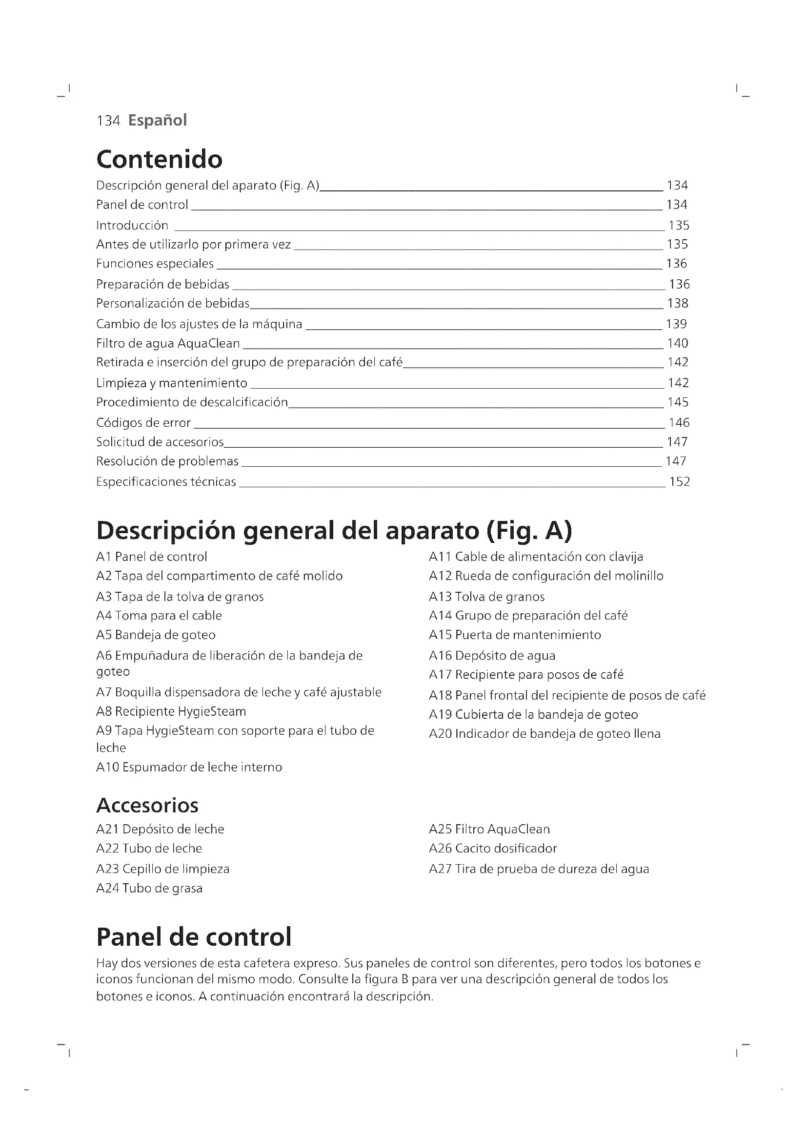 Español Contenido Descripción general del aparato (Fig. A)______________________________________________________ 134 Panel de control __________________________________________________________________________ 134 Introducción _____________________________________________________________________________ 135 Antes de utilizarlo por primera vez __________________________________________________________ 135 Funciones especiales ______________________________________________________________________ 136 Preparación de bebidas ____________________________________________________________________ 136 Personalización de bebidas_________________________________________________________________ 138 Cambio de los ajustes de la máquina ________________________________________________________ 139 Filtro de agua AquaClean __________________________________________________________________ 140 Retirada e inserción del grupo de preparación del café_________________________________________ 142 Limpieza y mantenimiento _________________________________________________________________ 142 Procedimiento de descalcificación___________________________________________________________ 145 Códigos de error __________________________________________________________________________ 146 Solicitud de accesorios_____________________________________________________________________ 147 Resolución de problemas __________________________________________________________________ 147 Especificaciones técnicas ___________________________________________________________________ 152 Descripción general del aparato (Fig. A) A1 Panel de control A2 Tapa del compartimento de café molido A3 Tapa de la tolva de granos A4 Toma para el cable A5 Bandeja de goteo A6 Empuñadura de liberación de la bandeja de goteo A7 Boquilla dispensadora de leche y café ajustable A8 Recipiente HygieSteam A9 Tapa HygieSteam con soporte para el tubo de leche A10 Espumador de leche interno A11 Cable de alimentación con clavija A12 Rueda de configuración del molinillo A13 Tolva de granos A14 Grupo de preparación del café A15 Puerta de mantenimiento A16 Depósito de agua A17 Recipiente para posos de café A18 Panel frontal del recipiente de posos de café A19 Cubierta de la bandeja de goteo A20 Indicador de bandeja de goteo llena Accesorios A21 Depósito de leche A22 Tubo de leche A23 Cepillo de limpieza A24 Tubo de grasa A25 Filtro AquaClean A26 Cacito dosificador A27 Tira de prueba de dureza del agua Panel de control Hay dos versiones de esta cafetera expreso. Sus paneles de control son diferentes, pero todos los botones e iconos funcionan del mismo modo. Consulte la figura B para ver una descripción general de todos los botones e iconos. A continuación encontrará la descripción.135 Español Utilice las flechas hacia arriba y hacia abajo para desplazarse por la pantalla y toque el icono OK (Aceptar) para seleccionar o confirmar las selecciones. B1 Botón de encendido/apagado B2 Iconos de bebidas con un solo toque: B3 Icono de CoffeeMaestro B4 Menú con más bebidas B5 Botón de inicio/parada B6 Iconos de navegación (arriba, abajo, atrás, aceptar) B7 Pantalla B8 Ajustes de la cafetera B9 Menú de limpieza B10 Perfiles personales Introducción Enhorabuena por la adquisición de una cafetera totalmente automática Saeco. Para disfrutar de todo el soporte en línea que Saeco ofrece, visite www.saeco.com/MyCoffeeMachine y registre su producto. Nota: Este aparato se ha probado con café. Aunque se ha limpiado cuidadosamente, es posible que quede algún residuo de café. Le garantizamos, no obstante, que el aparato es absolutamente nuevo. Antes de utilizarlo por primera vez