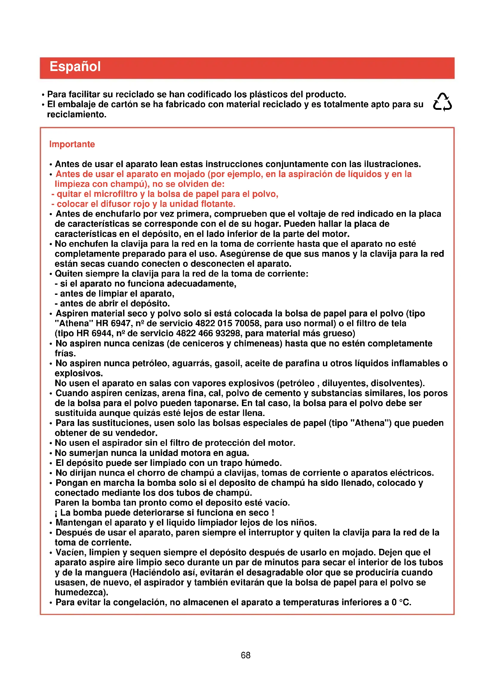 - Aspiren material seco y polvo solo si está colocada la bolsa de papel para el polvo (tipo "Athena" HR 6947, nº de servicio 4822 015 70058, para uso normal) o el filtro de tela (tipo HR 6944, nº de servicio 4822 466 93298, para material más grueso)