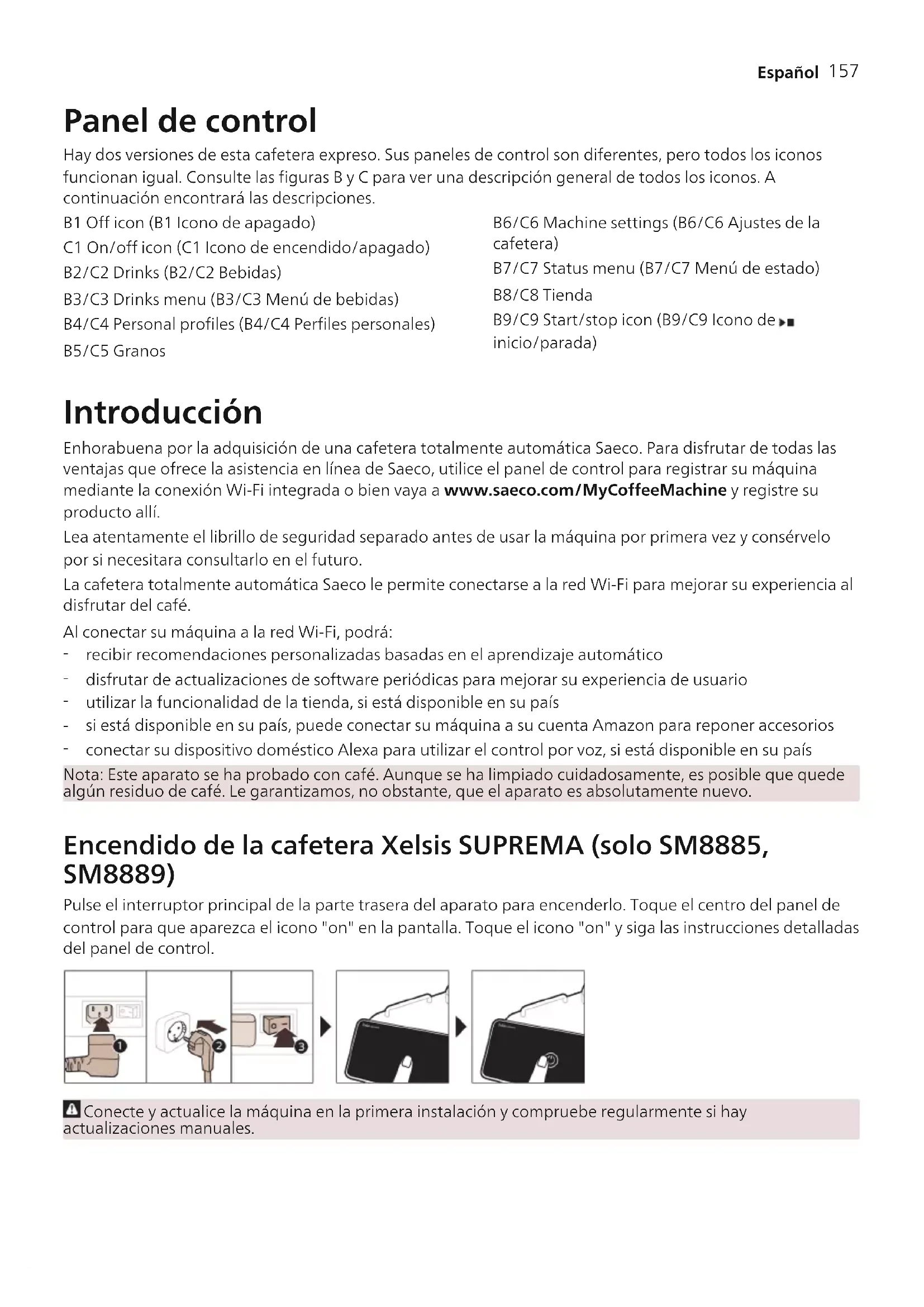 Español Contenido Descripción general del aparato (Fig. A)______________________________________________________ 156 Panel de control __________________________________________________________________________ 157 Introducción _____________________________________________________________________________ 157 Funciones especiales ______________________________________________________________________ 158 Preparación de bebidas ____________________________________________________________________ 159 Cambio de los ajustes de la máquina ________________________________________________________ 163 Filtro de agua AquaClean __________________________________________________________________ 164 Retirada e inserción del grupo de preparación del café_________________________________________ 165 Limpieza y mantenimiento _________________________________________________________________ 165 Procedimiento de descalcificación___________________________________________________________ 168 Códigos de error __________________________________________________________________________ 169 Solicitud de accesorios_____________________________________________________________________ 170 Actualizaciones de software________________________________________________________________ 171 Resolución de problemas __________________________________________________________________ 171 Especificaciones técnicas ___________________________________________________________________ 177 Declaración de conformidad _______________________________________________________________ 177 Wi-Fi ____________________________________________________________________________________ 178 Descripción general del aparato (Fig. A) A1 Tapa de la tolva de granos A2 Tapa del compartimento de café molido A3 Bandeja para tazas A4 Panel de control A5 Toma para el cable A6 Interruptor principal A7 Bandeja de goteo A8 Empuñadura de liberación de la bandeja de goteo A9 HygieSteam Depósito A10 HygieSteam Tapa con soporte para el tubo de leche A11 Boquilla dispensadora de leche y café ajustable en altura A12 Espumador de leche interno A13 Cable de alimentación con enchufe A14 Botón de configuración del molinillo (para obtener más información, visite www.saeco.com/care) A15 Tolva de granos A16 Puerta de mantenimiento A17 Abertura de café A18 Cajón de residuos de café A19 Grupo de preparación del café (para obtener más información, visite www.saeco.com/care) A20 Recipiente para posos de café A21 Depósito de agua A22 Tapa del depósito de agua A23 Indicador de bandeja de goteo llena A24 Cubierta de la bandeja de goteo Accesorios A25 Depósito de leche A26 Tubo de leche A27 Cepillo de limpieza A28 Tubo de grasa A29 Filtro AquaClean A30 Cacito dosificador A31 Tira de prueba de dureza del agua157 Español Panel de control Hay dos versiones de esta cafetera expreso. Sus paneles de control son diferentes, pero todos los iconos funcionan igual. Consulte las figuras B y C para ver una descripción general de todos los iconos. A continuación encontrará las descripciones. B1 Off icon (B1 Icono de apagado) C1 On/off icon (C1 Icono de encendido/apagado) B2/C2 Drinks (B2/C2 Bebidas) B3/C3 Drinks menu (B3/C3 Menú de bebidas) B4/C4 Personal profiles (B4/C4 Perfiles personales) B5/C5 Granos B6/C6 Machine settings (B6/C6 Ajustes de la cafetera) B7/C7 Status menu (B7/C7 Menú de estado) B8/C8 Tienda B9/C9 Start/stop icon (B9/C9 Icono de inicio/parada) Introducción Enhorabuena por la adquisición de una cafetera totalmente automática Saeco. Para disfrutar de todas las ventajas que ofrece la asistencia en línea de Saeco, utilice el panel de control para registrar su máquina mediante la conexión Wi-Fi integrada o bien vaya a www.saeco.com/MyCoffeeMachine y registre su producto allí. Lea atentamente el librillo de seguridad separado antes de usar la máquina por primera vez y consérvelo por si necesitara consultarlo en el futuro. La cafetera totalmente automática Saeco le permite conectarse a la red Wi-Fi para mejorar su experiencia al disfrutar del café. Al conectar su máquina a la red Wi-Fi, podrá: