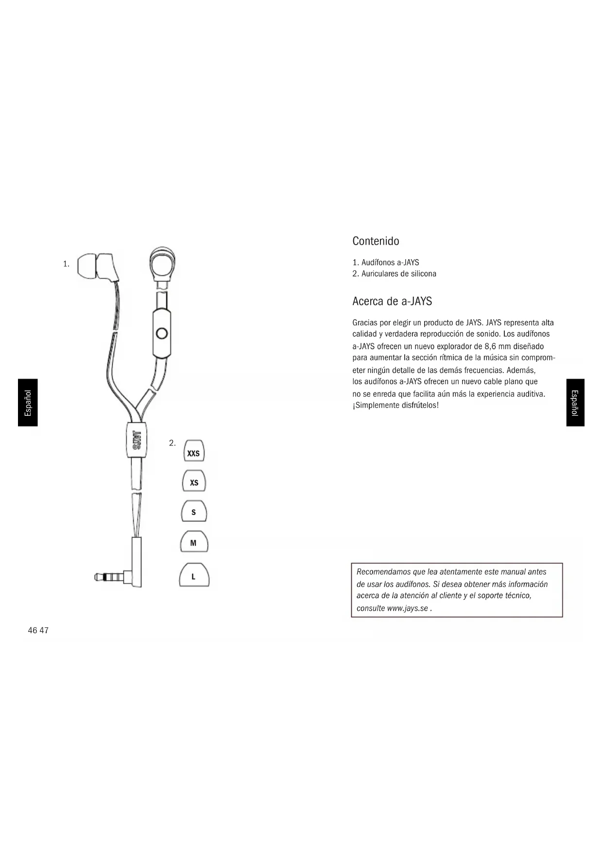 Acerca de a-JAYS Gracias por elegir un producto de JAYS. JAYS representa alta calidad y verdadera reproducción de sonido. Los audífonos a-JAYS ofrecen un nuevo explorador de 8,6 mm diseñado para aumentar la sección rítmica de la música sin comprom- eter ningún detalle de las demás frecuencias. Además, los audífonos a-JAYS ofrecen un nuevo cable plano que no se enreda que facilita aún más la experiencia auditiva. ¡Simplemente disfrútelos! Recomendamos que lea atentamente este manual antes de usar los audífonos. Si desea obtener más información acerca de la atención al cliente y el soporte técnico, consulte www.jays.se . XXS