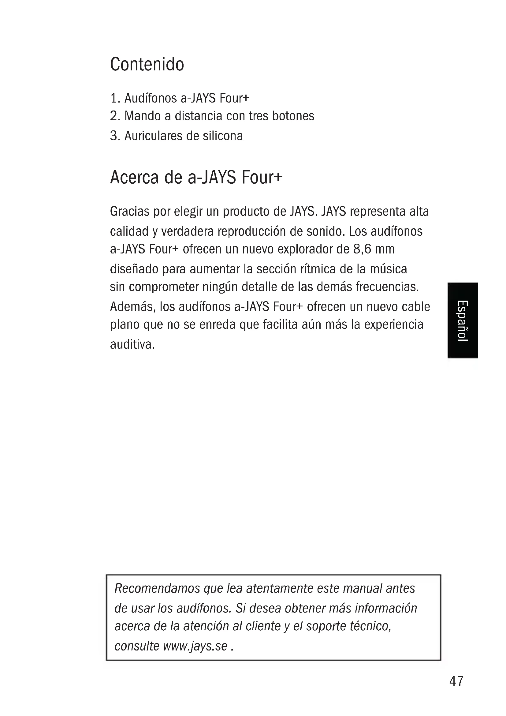 Acerca de a-JAYS Four+ Gracias por elegir un producto de JAYS. JAYS representa alta calidad y verdadera reproducción de sonido. Los audífonos a-JAYS Four+ ofrecen un nuevo explorador de 8,6 mm diseñado para aumentar la sección rítmica de la música sin comprometer ningún detalle de las demás frecuencias. Además, los audífonos a-JAYS Four+ ofrecen un nuevo cable plano que no se enreda que facilita aún más la experiencia auditiva. Recomendamos que lea atentamente este manual antes de usar los audífonos. Si desea obtener más información acerca de la atención al cliente y el soporte técnico, consulte www.jays.se .48 Español Especicaciones Controlador: Controlador: Parlante dinámico de 8,6 mm Aislamiento: Sistema de aislamiento acústico JAYS Sensibilidad: 96dB NPS @ 1kHz Impedancia: 16 Ohm Frecuencia de respuesta: 20 - 21 000 Hz Longitud del cable: 115 cm Peso: 17 gramos Conector: Conector plateado de 3,5 mm Micrófono: Tecnología MEMS49 Español Detalle de las especicaciones del producto Presión acústica, decibelio y Hz El sonido es una vibración invisible compuesta de frecuen- cias que viajan en forma de ondulaciones conocidas como ondas de sonido. La amplitud de la vibración que produce un objeto, como el controlador de parlante, es proporcional al cambio de presión generado a medida que la onda se expande por el ambiente que lo rodea (como el aire). Por lo tanto, la amplitud de una onda de sonido por lo general se mide por su nivel de presión. El decibelio es una escala adimensional y logarítmica para denotar un cambio relativo en la intensidad de una señal u onda. Cuando se encuentra en un contexto de nivel de presión acústica, mide el umbral de audición nominal, equivalente al sonido más bajo que el oído humano pueda percibir. La frecuencia de casos en los que una onda de sonido alcanza el máximo de percepción durante un periodo de tiempo se mide en Hz (hertz). Esto reere a la cantidad de círculos completos por segundo. El oído humano está limitado a percibir frecuencias que van de los 20 a los