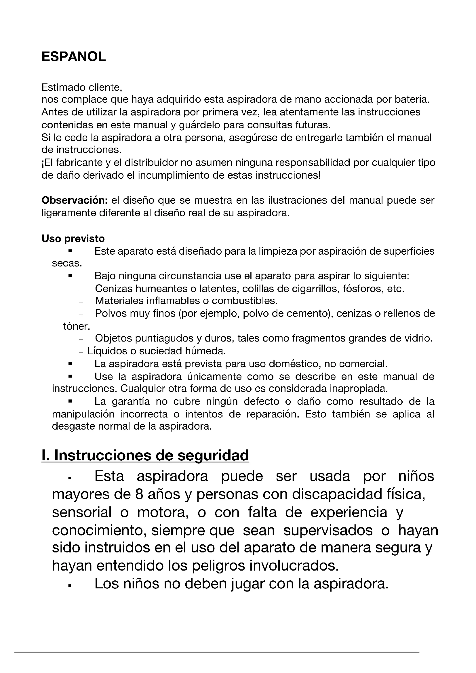 § Esta aspiradora puede ser usada por niños mayores de 8 años y personas con discapacidad física, sensorial o motora, o con falta de experiencia y conocimiento, siempre que sean supervisados o hayan sido instruidos en el uso del aparato de manera segura y hayan entendido los peligros involucrados. § Los niños no deben jugar con la aspiradora.§ Los niños no deben dejarse a cargo de la limpieza ni del mantenimiento de la aspiradora. § ¡Mantenga la aspiradora y su cable de alimentación fuera del alcance de animales y de niños con menos de 8 años de edad! § Vigile a los niños para garantizar que no jueguen y/o se lesionen ellos mismos con la aspiradora. § Siempre use y guarde la aspiradora fuera del alcance de niños y animales. El uso inadecuado de la aspiradora puede provocar lesiones y descargas eléctricas. El cable de alimentación también se debe mantener fuera del alcance de niños y animales. § Antes de montar, desmontar o limpiar la aspiradora, desconéctela del tomacorriente. § Recargue la batería únicamente con el cargador y la estación de carga que se incluyen con la aspiradora. No use el cargador ni la estación de carga para cargar otro dispositivo que no sea esta aspiradora de mano. § Nunca sumerja la aspiradora, su cable de alimentación o el cargador en agua u otros líquidos y asegúrese de que estos no corran el riesgo de caer en agua ni mojarse por accidente. § Si el cable de alimentación o el cargador están deteriorados, deben ser remplazados por el fabricante, en el centro de atención al cliente, o por una persona cualificada (por ejemplo, técnico de un taller especializado) para evitar cualquier peligro. Para prevenir lesiones § Mantenga la aspiradora y el material de embalaje fuera del alcance de niños y animales. ¡Peligro de lesiones personales y asfixia!§ No use la aspiradora si presenta cualquier desperfecto. § Durante el uso, mantenga la boquilla de aspiración alejada de las partes del cuerpo y mascotas. Estas pueden quedar atrapadas en la aspiradora. Si la aspiradora se adhiere a la superficie, apáguela inmediatamente por el interruptor ON/OFF. Para prevenir descargas eléctricas e incendios § Siempre enchufe el cargador a un tomacorriente de pared debidamente instalado con conexión a tierra. El tomacorriente debe de estar siempre a su alcance para que pueda desconectar la aspiradora rápidamente en caso de emergencias. La tensión de su red eléctrica debe corresponder a la indicada en la placa de características de la aspiradora. Puede usar cables de extensión siempre que cumplan las exigencias técnicas de la aspiradora o del cargador. § Si la aspiradora cae dentro del agua, desconecte el cable de alimentación inmediatamente. ¡Nunca trate de sacar la aspiradora del agua estando conectada al tomacorriente! § Nunca toque la aspiradora, el cable de alimentación o el cargador con las manos mojadas estando el cable conectado al tomacorriente. § Apague la aspiradora y desenchufe el cargador del tomacorriente cuando no esté en uso, antes de una tormenta, si ocurre cualquier falla durante el funcionamiento o si succiona objetos extraños durante la aspiración. § No use la aspiradora con el cable de alimentación enchufado o conectada a la estación de carga.§ Siempre desenchufe la aspiradora empuñando firmemente el cargador y nunca tirando del cable de alimentación. § Use la aspiradora solamente en interiores. § No use la aspiradora en habitaciones que contengan polvo fácilmente inflamable o vapores tóxicos y explosivos. § No use la aspiradora en ambientes muy húmedos o cerca de materiales inflamables. § Para su propia seguridad, siempre revise la aspiradora antes de cada uso. ¡No la utilice si el aparato como tal, la batería, el cable de alimentación o el cargador presentan cualquier indicio de daño! Precauciones con la batería recargable § La ingestión de baterías recargables o del ácido en su interior puede ser mortal. Procure atención médica de inmediato si ha ingerido cualquiera de estos elementos. § Antes de insertar la batería en la aspiradora, compruebe si los contactos están limpios y límpielos en caso contrario. § Utilice únicamente el tipo de batería que se especifica en la placa de características de la aspiradora. § Si la batería se revienta o presenta fugas, no permita que el ácido haga contacto con su piel, ojos o membranas mucosas. Si esto ocurre, enjuague inmediatamente los sitios afectados con agua potable en abundancia y procure atención médica lo más rápido posible. § Si una batería presenta fugas, se debe retirar inmediatamente de la aspiradora. Limpie bien los contactos antes de insertar una batería nueva.§ Las baterías no se deben desechar en la basura común y no se deben abrir, arrojar al fuego, sumergir en líquidos ni poner en cortocircuito. Para prevenir daños materiales y a la propiedad § Siempre coloque la aspiradora sobre una superficie firme, plana, seca y resistente al calor. § Acomode el cable de alimentación de modo que no suponga un peligro de tropiezo. § Asegúrese de que el cable de alimentación no se pellizque, se tuerza o pase por bordes afilados y que no entre en contacto con superficies calientes. § Mantenga una distancia prudente de fuentes de calor, tales como hornos o estufas, para proteger la aspiradora. No coloque ninguna llama abierta, tal como velas encendidas, en las proximidades de la aspiradora, el cable de alimentación, la batería o el cargador. § Evite que la aspiradora se caiga y no la someta a vibraciones fuertes. § No arrastre, recoja o levante la aspiradora tirando del cable de alimentación. § No someta la aspiradora a temperaturas extremas, cambios severos de temperatura, humedad, vapores o a la acción directa de la luz solar. § No utilice productos de limpieza corrosivos o abrasivos para limpiar la aspiradora, estos pueden deteriorar la superficie. § ¡Use la aspiradora únicamente después de haberla mont