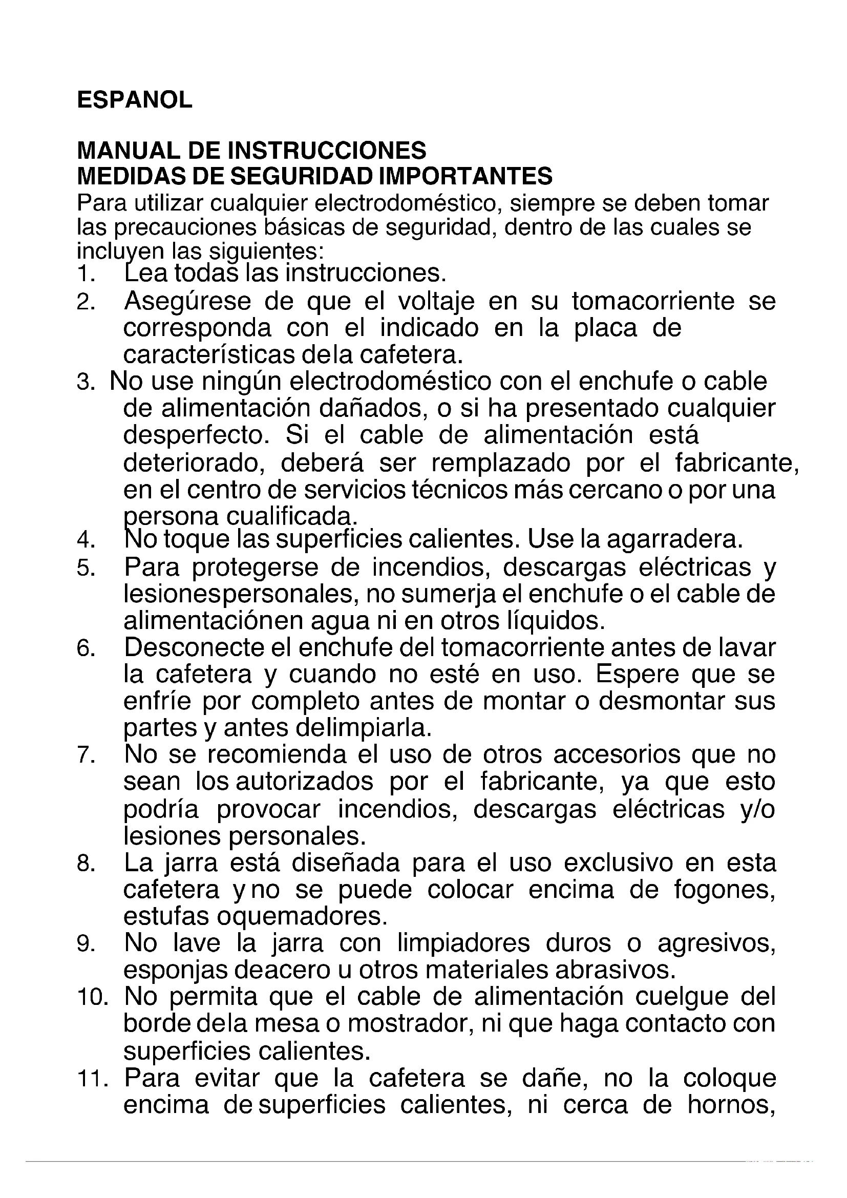 9. Siempre apague la cafetera por el interruptor y desconéctela del tomacorriente luego del uso.