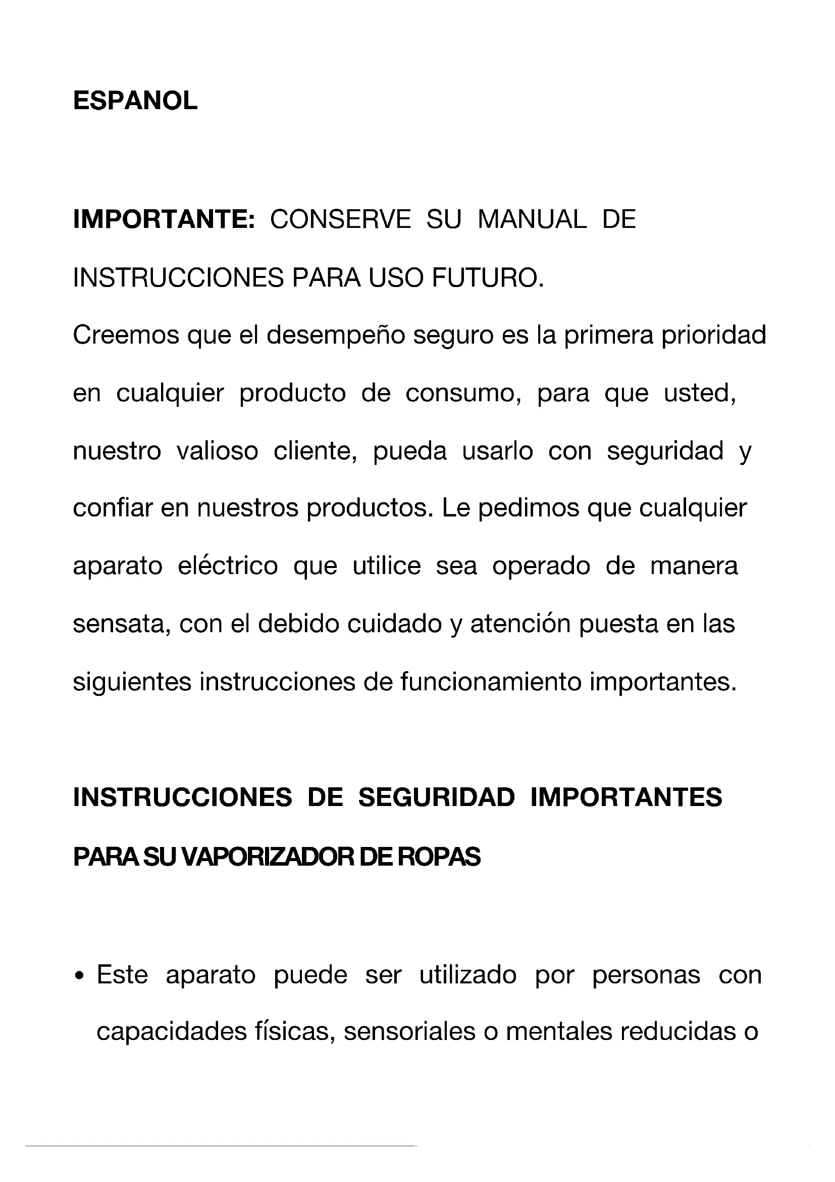 INSTRUCCIONES PARA USO FUTURO. Creemos que el desempeño seguro es la primera prioridad en cualquier producto de consumo, para que usted, nuestro valioso cliente, pueda usarlo con seguridad y confiar en nuestros productos. Le pedimos que cualquier aparato eléctrico que utilice sea operado de manera sensata, con el debido cuidado y atención puesta en las siguientes instrucciones de funcionamiento importantes.