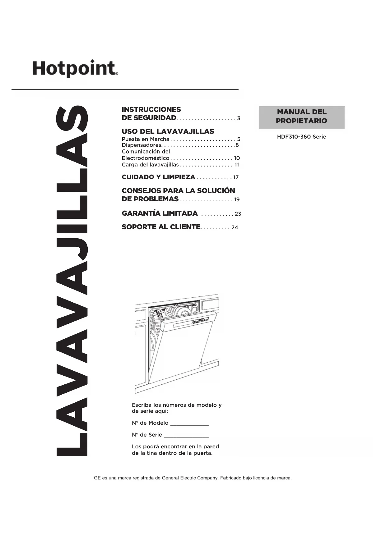 HDF310-360 Serie2 49-4000228 GRACIAS POR HACER QUE GE APPLIANCES SEA PARTE DE SU HOGAR. Ya sea que haya crecido usando GE Appliances, o que ésta es su primera vez, nos complace tenerlo en la familia. Sentimos orgullo por el nivel de arte, innovación y diseño de cada uno de los electrodomésticos de GE Appliances, y creemos que usted también. Entre otras cosas, el registro de su electrodoméstico asegura que podamos entregarle información importante del producto y detalles de la garantía cuando los necesite. Registre su electrodoméstico GE ahora a través de Internet. Sitios Web y números telefónicos útiles están disponibles en la sección de Soporte para el Consumidor de este Manual del Propietario. También puede enviar una carta en la tarjeta de inscripción preimpresa que se incluye con el material embalado.49-4000228 3