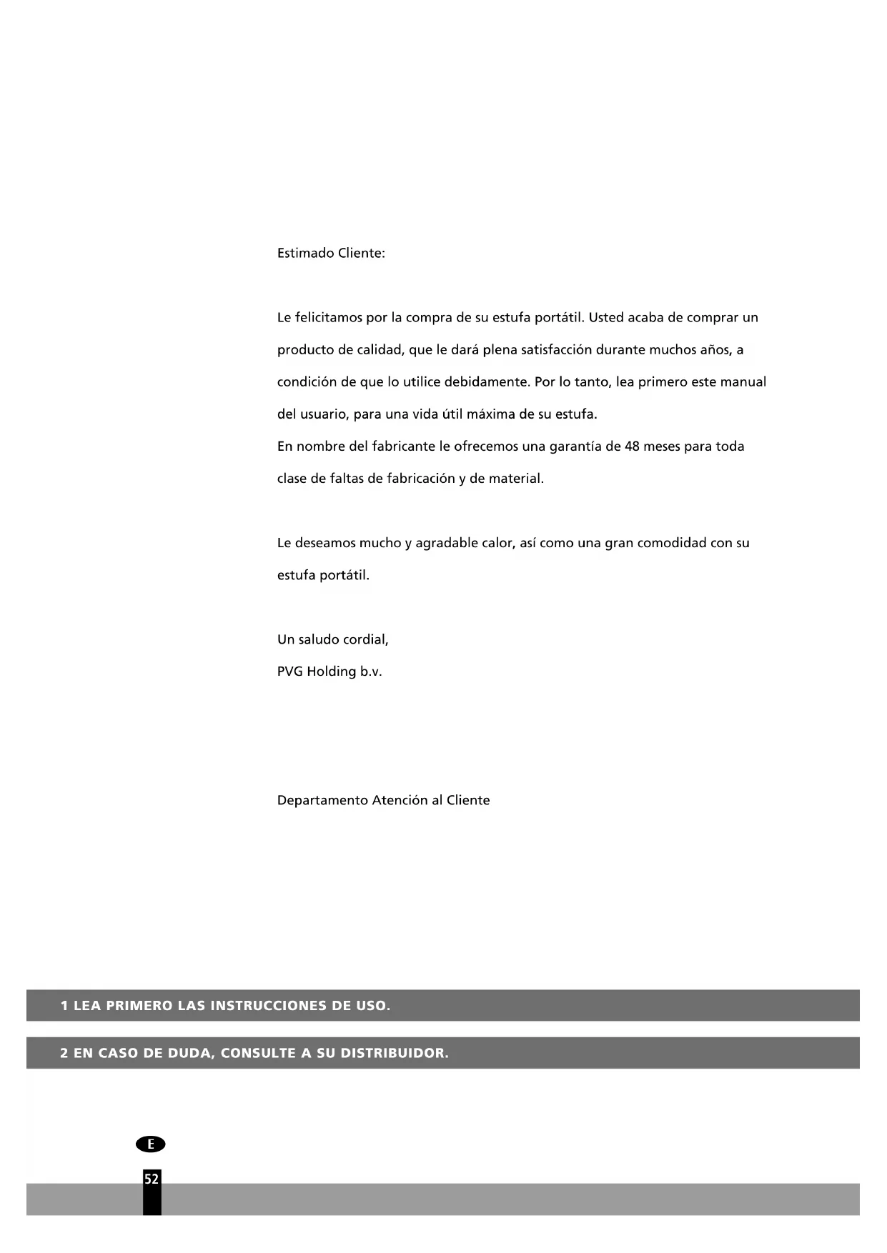 23Estimado Cliente: Le felicitamos por la compra de su estufa portátil. Usted acaba de comprar un producto de calidad, que le dará plena satisfacción durante muchos años, a condición de que lo utilice debidamente. Por lo tanto, lea primero este manual del usuario, para una vida útil máxima de su estufa. En nombre del fabricante le ofrecemos una garantía de 48 meses para toda clase de faltas de fabricación y de material. Le deseamos mucho y agradable calor, así como una gran comodidad con su estufa portátil. Un saludo cordial, PVG Holding b.v. Departamento Atención al Cliente 1 LEA PRIMERO LAS INSTRUCCIONES DE USO. 2 EN CASO DE DUDA, CONSULTE A SU DISTRIBUIDOR.
