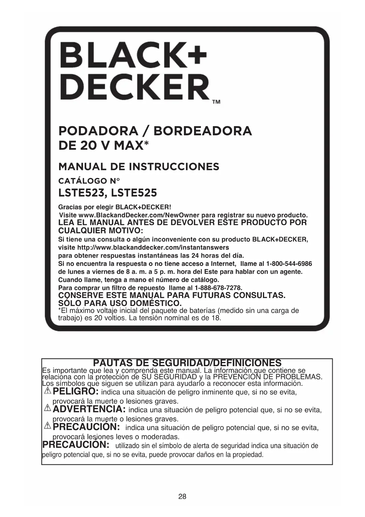 Gracias por elegir BLACK+DECKER! Visite www.BlackandDecker.com/NewOwner para registrar su nuevo producto. LEA EL MANUAL ANTES DE DEVOLVER ESTE PRODUCTO POR CUALQUIER MOTIVO: Si tiene una consulta o algún inconveniente con su producto BLACK+DECKER, visite http://www.blackanddecker.com/instantanswers para obtener respuestas instantáneas las 24 horas del día.Si no encuentra la respuesta o no tiene acceso a Internet, llame al 1-800-544-6986 de lunes a viernes de 8 a. m. a 5 p. m. hora del Este para hablar con un agente. Cuando llame, tenga a mano el número de catálogo.Para comprar un filtro de repuesto llame al 1-888-678-7278. CONSERVE ESTE MANUAL PARA FUTURAS CONSULTAS. SÓLO PARA USO DOMÉSTICO. *El máximo voltaje inicial del paquete de baterías (medido sin una carga de trabajo) es 20 voltios. La tensión nominal es de 18.