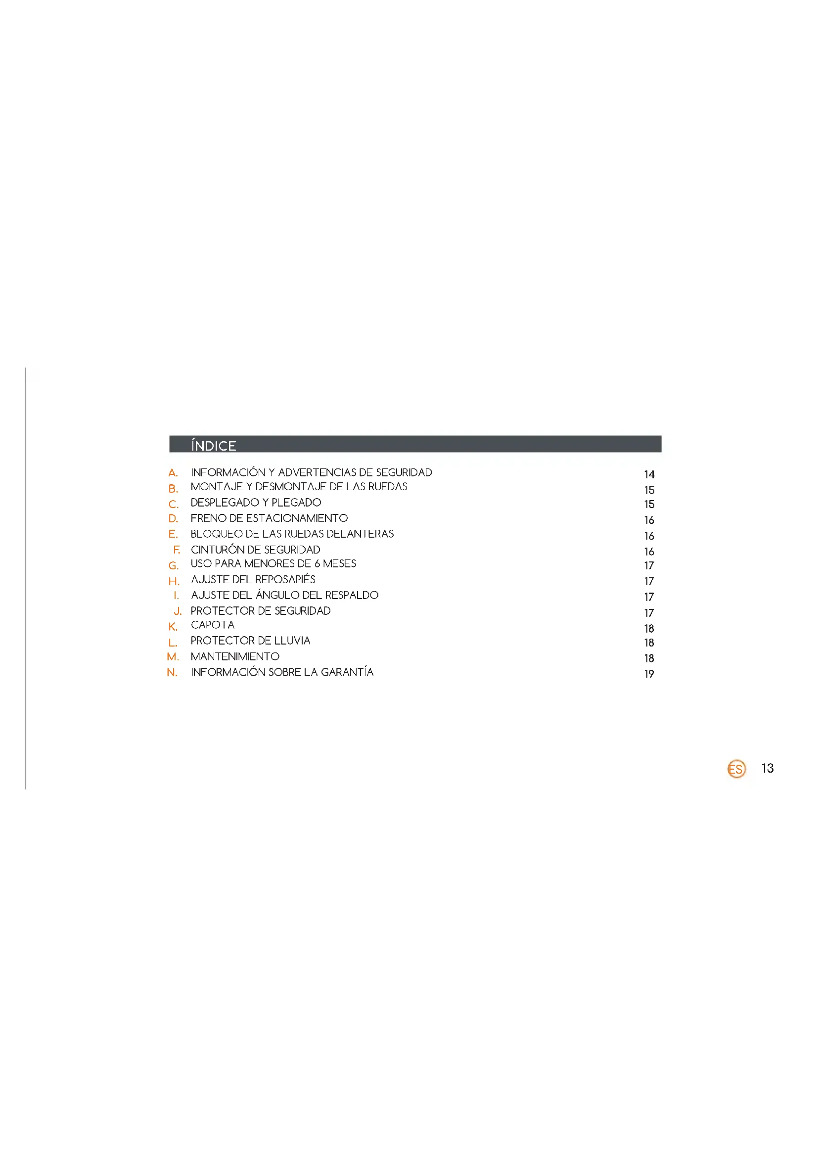 A. INFORMACIÓN Y ADVERTENCIAS DE SEGURI- DAD Instrucciones IMPORTANTE : Leer detenidamente y mantenerlas para fu- turas consultas. ADVERTENCIAS : - No dejar nunca al niño desatendido. - Asegurarse de que todos los dispositivos de cierre están engranados antes del uso. - Para evitar lesiones, asegúrese de que el niño se mantiene alejado durante el desplegado y el plegado de este pro- ducto. - No permita que el niño juegue con este producto. - Usar siempre el sistema de retención. - Comprobar que los dispositivos de sujeción del capazo, del asiento o de la silla de coche están correctamente en- granados antes del uso. - Este producto no es adecuado para correr o patinar. - Esta silla es adecuada para niños a partir del nacimiento y hasta 15 kg. - Nunca permita que el niño se ponga de pie en el reposa- piés o estribo. RESTRICCIONES DE USO : - Se recomienda el uso en la posición más reclinada des- de nacimiento hasta los 6 meses. - Active siempre el freno de la silla antes de colocar o reti- rar los niños de la silla. - Cualquier carga jada al manillar y/o a la parte trasera del respaldo y/o a los laterales de la silla afecta a la es- tabilidad de ésta. - Esta silla ha sido diseñada para uno o dos niños, no uti- lizarlo con más de dos niños a la vez. - No deben utilizarse accesorios no aprobados por JANÉ. - Solo deben utilizarse los repuestos suministrados o re- comendados por JANÉ. - Para los portabebés usados con un chasis, esta silla no reemplaza una cuna o cama. Si el niño necesita dormir, debería colocarse en un capazo, una cuna o una ca- madecuados. - La masa máxima permitida de la cestilla portaobjetos nunca puede superar lo indicado en la cestilla (4 kg). - Este producto no es resistente al agua salada.15