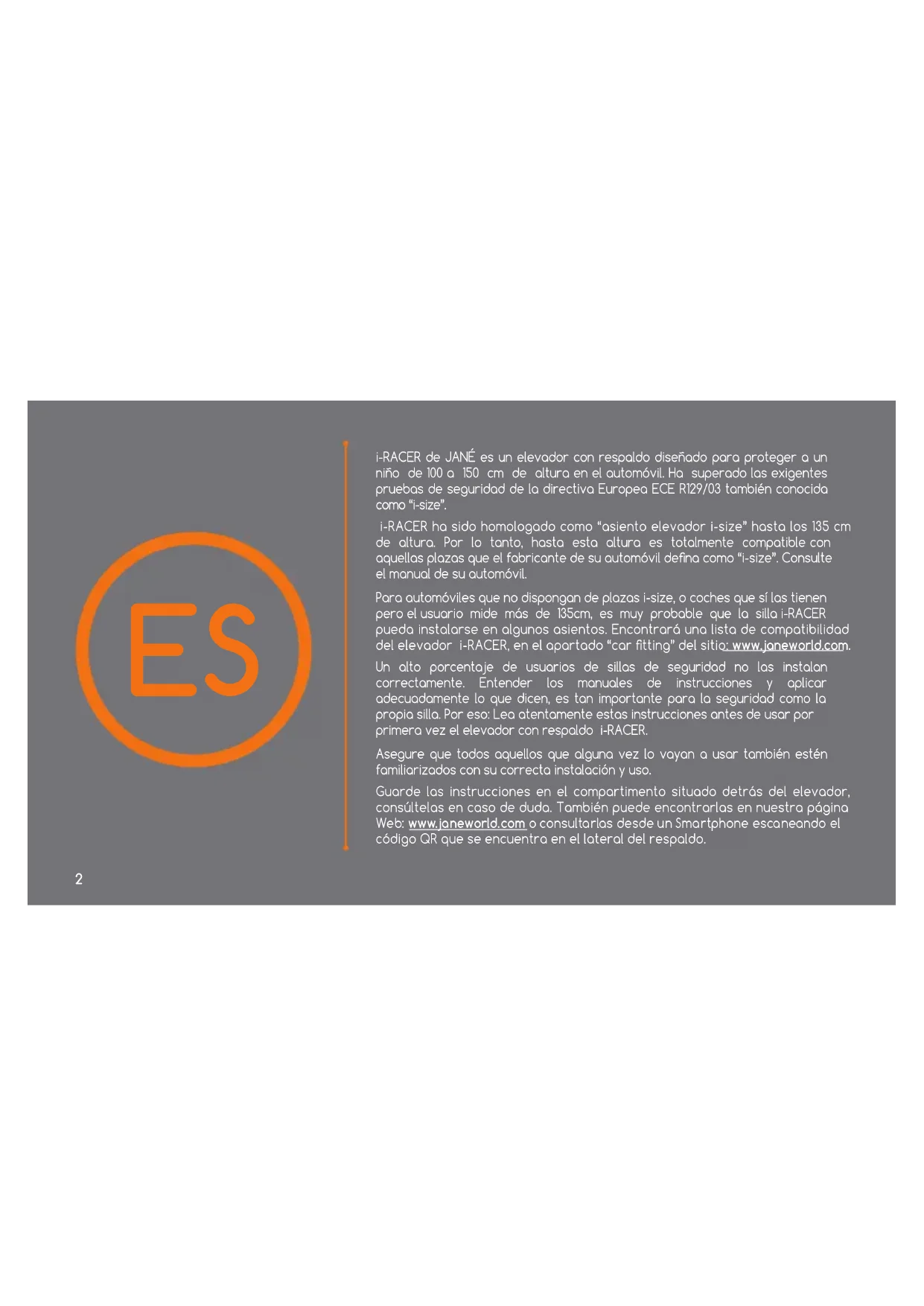 i-RACER de JANÉ es un elevador con respaldo diseñado para proteger a un niño de 100 a 150 cm de altura en el automóvil. Ha superado las exigentes pruebas de seguridad de la directiva Europea ECE R129/03 también conocida como “i-size”. i-RACER ha sido homologado como “asiento elevador i-size” hasta los 135 cm de altura. Por lo tanto, hasta esta altura es totalmente compatible con aquellas plazas que el fabricante de su automóvil dena como “i-size”. Consulte el manual de su automóvil. Para automóviles que no dispongan de plazas i-size, o coches que sí las tienen pero el usuario mide más de 135cm, es muy probable que la silla i-RACER pueda instalarse en algunos asientos. Encontrará una lista de compatibilidad del elevador i-RACER, en el apartado “car tting” del sitio: www.janeworld.com. Un alto porcentaje de usuarios de sillas de seguridad no las instalan correctamente. Entender los manuales de instrucciones y aplicar adecuadamente lo que dicen, es tan importante para la seguridad como la propia silla. Por eso: Lea atentamente estas instrucciones antes de usar por primera vez el elevador con respaldo i-RACER. Asegure que todos aquellos que alguna vez lo vayan a usar también estén familiarizados con su correcta instalación y uso. Guarde las instrucciones en el compartimento situado detrás del elevador, consúltelas en caso de duda. También puede encontrarlas en nuestra página Web: www.janeworld.com o consultarlas desde un Smartphone escaneando el código QR que se encuentra en el lateral del respaldo.3