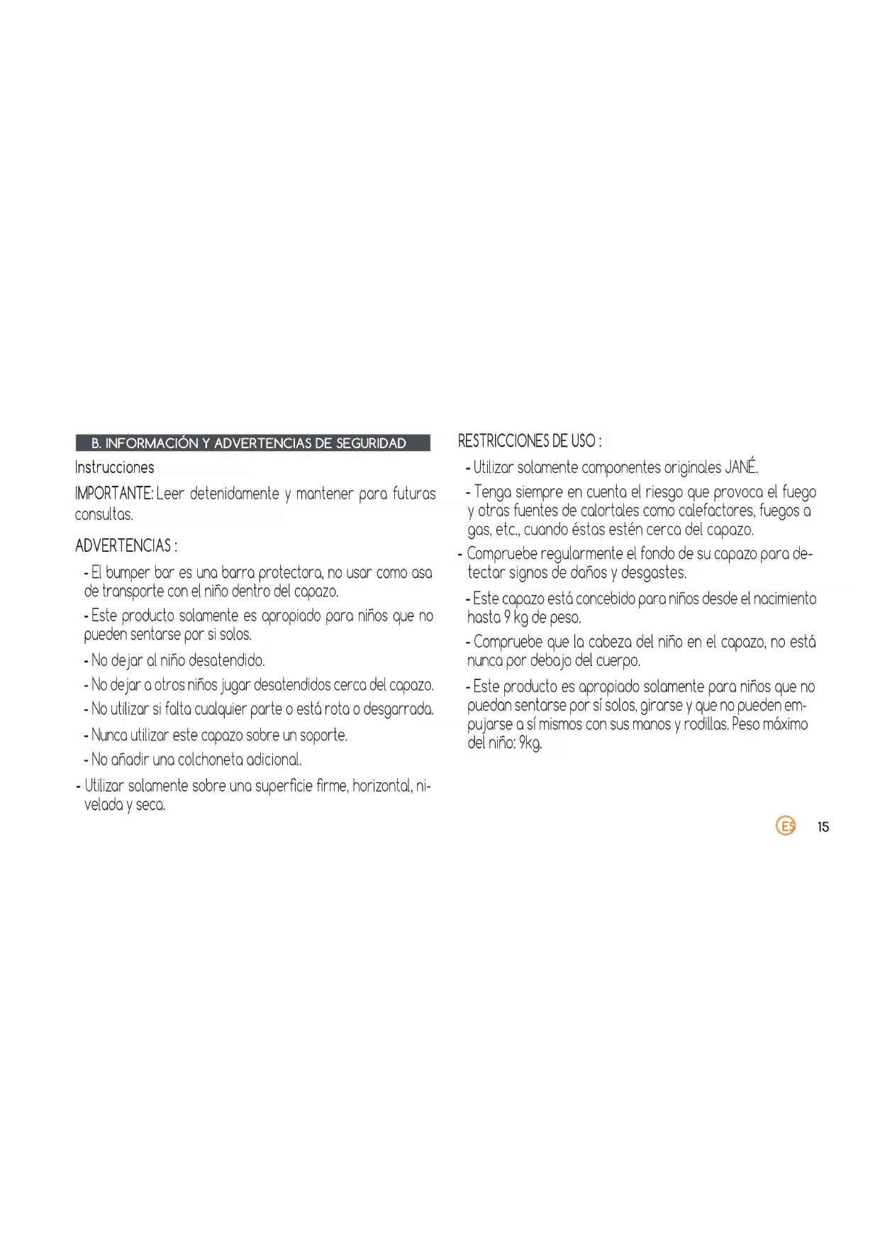 B. INFORMACIÓN Y ADVERTENCIAS DE SEGURIDAD Instrucciones IMPORTANTE: Leer detenidamente y mantener para futuras consultas. ADVERTENCIAS : - El bumper bar es una barra protectora, no usar como asa de transporte con el niño dentro del capazo. - Este producto solamente es apropiado para niños que no pueden sentarse por si solos. - No dejar al niño desatendido. - No dejar a otros niños jugar desatendidos cerca del capazo. - No utilizar si falta cualquier parte o está rota o desgarrada. - Nunca utilizar este capazo sobre un soporte. - No añadir una colchoneta adicional. - Utilizar solamente sobre una supercie rme, horizontal, ni- velada y seca. RESTRICCIONES DE USO : - Utilizar solamente componentes originales JANÉ. - Tenga siempre en cuenta el riesgo que provoca el fuego y otras fuentes de calortales como calefactores, fuegos a gas, etc., cuando éstas estén cerca del capazo. - Compruebe regularmente el fondo de su capazo para de- tectar signos de daños y desgastes. - Este capazo está concebido para niños desde el nacimiento hasta 9 kg de peso. - Compruebe que la cabeza del niño en el capazo, no está nunca por debajo del cuerpo. - Este producto es apropiado solamente para niños que no puedan sentarse por sí solos, girarse y que no pueden em- pujarse a sí mismos con sus manos y rodillas. Peso máximo del niño: 9kg. IM 1987,04 MICRO BB ins janeworld.indd 15 12/7/21 10:5616