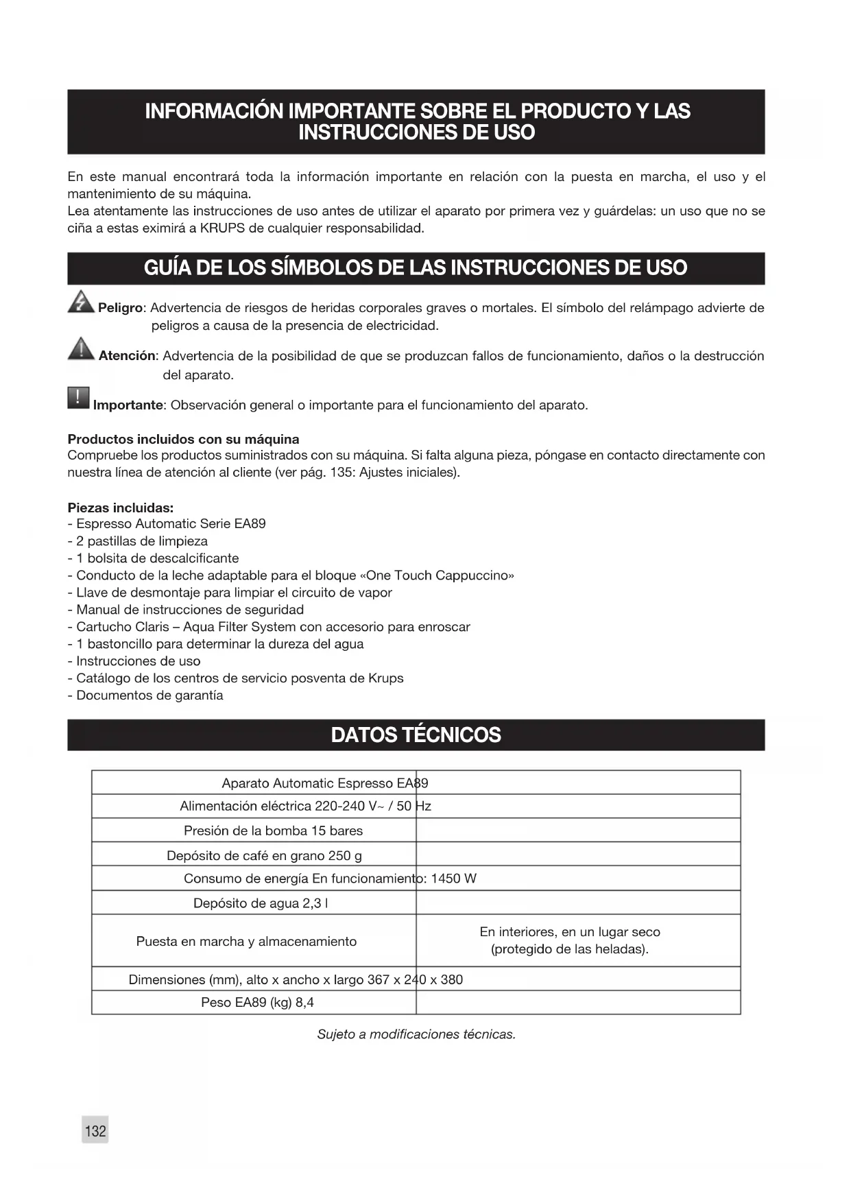 Importante: Observación general o importante para el funcionamiento del aparato. Productos incluidos con su máquina Compruebe los productos suministrados con su máquina. Si falta alguna pieza, póngase en contacto directamente con nuestra línea de atención al cliente (ver pág. 135: Ajustes iniciales). Piezas incluidas: - Espresso Automatic Serie EA89 - 2 pastillas de limpieza - 1 bolsita de descalcicante - Conducto de la leche adaptable para el bloque «One Touch Cappuccino» - Llave de desmontaje para limpiar el circuito de vapor - Manual de instrucciones de seguridad - Cartucho Claris – Aqua Filter System con accesorio para enroscar - 1 bastoncillo para determinar la dureza del agua - Instrucciones de uso - Catálogo de los centros de servicio posventa de Krups - Documentos de garantía