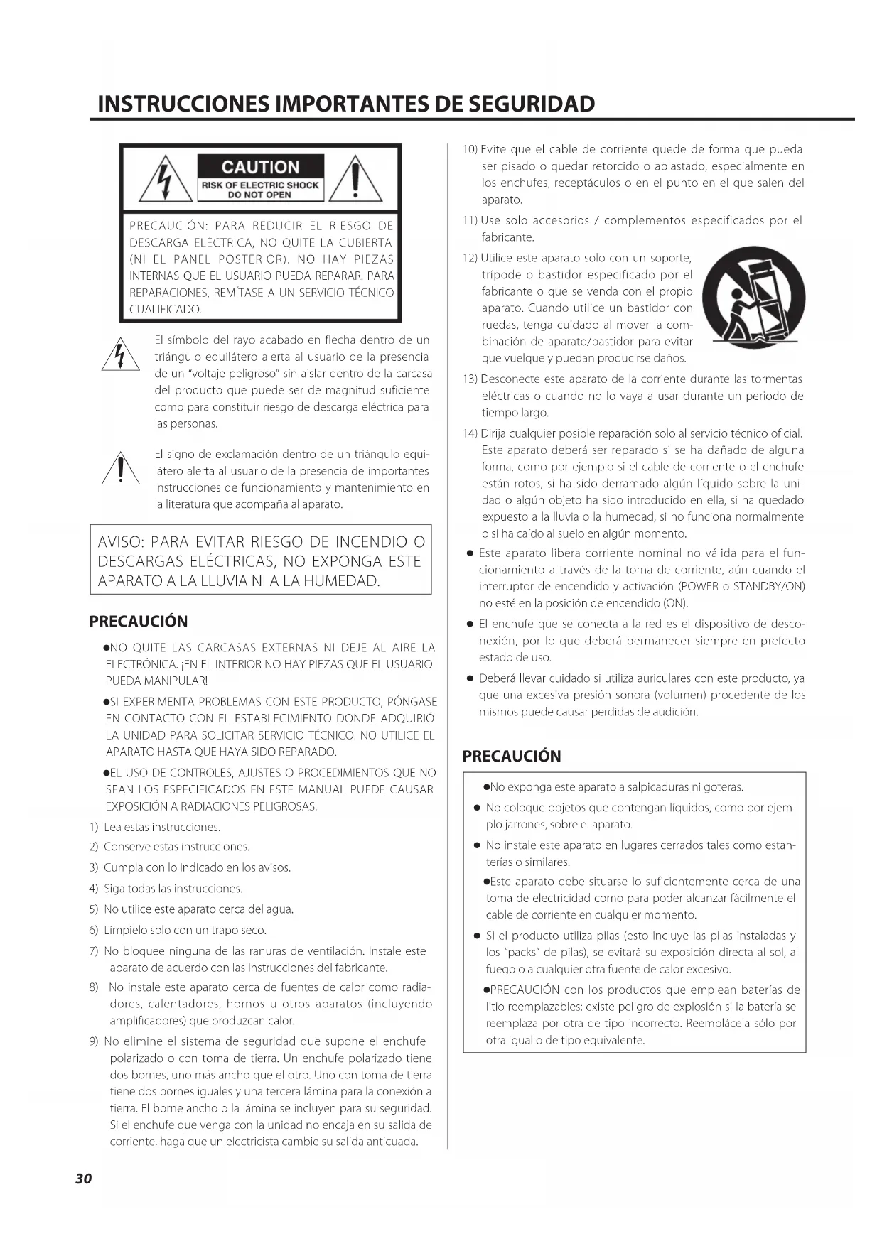 Este aparato deberá ser reparado si se ha dañado de alguna forma, como por ejemplo si el cable de corriente o el enchufe están rotos, si ha sido derramado algún líquido sobre la uni- dad o algún objeto ha sido introducido en ella, si ha quedado expuesto a la lluvia o la humedad, si no funciona normalmente o si ha caído al suelo en algún momento. o Este aparato libera corriente nominal no válida para el fun- cionamiento a través de la toma de corriente, aún cuando el interruptor de encendido y activación (POWER o STANDBY/ON) no esté en la posición de encendido (ON). o El enchufe que se conecta a la red es el dispositivo de desco- nexión, por lo que deberá permanecer siempre en prefecto estado de uso. o Deberá llevar cuidado si utiliza auriculares con este producto, ya que una excesiva presión sonora (volumen) procedente de los mismos puede causar perdidas de audición. PRECAUCIÓN o No exponga este aparato a salpicaduras ni goteras. o No coloque objetos que contengan líquidos, como por ejem- plo jarrones, sobre el aparato. o No instale este aparato en lugares cerrados tales como estan- terías o similares. o Este aparato debe situarse lo suficientemente cerca de una toma de electricidad como para poder alcanzar fácilmente el cable de corriente en cualquier momento. o Si el producto utiliza pilas (esto incluye las pilas instaladas y los “packs” de pilas), se evitará su exposición directa al sol, al fuego o a cualquier otra fuente de calor excesivo. o PRECAUCIÓN con los productos que emplean baterías de litio reemplazables: existe peligro de explosión si la batería se reemplaza por otra de tipo incorrecto. Reemplácela sólo por otra igual o de tipo equivalente.ES