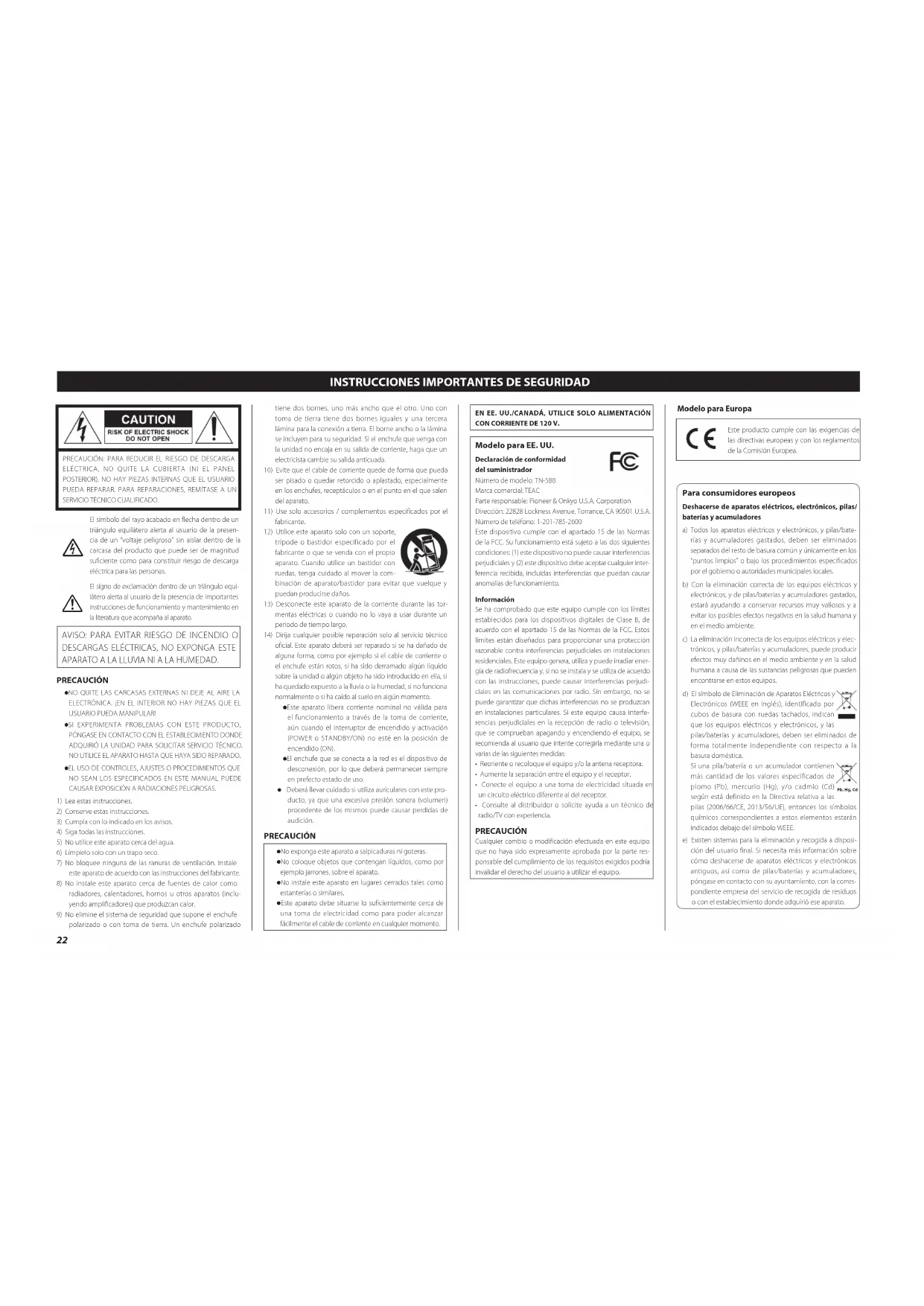 APARATO A LA LLUVIA NI A LA HUMEDAD. PRECAUCIÓN o NO QUITE LAS CARCASAS EXTERNAS NI DEJE AL AIRE LA ELECTRÓNICA. ¡EN EL INTERIOR NO HAY PIEZAS QUE EL USUARIO PUEDA MANIPULAR! o SI EXPERIMENTA PROBLEMAS CON ESTE PRODUCTO, PÓNGASE EN CONTACTO CON EL ESTABLECIMIENTO DONDE ADQUIRIÓ LA UNIDAD PARA SOLICITAR SERVICIO TÉCNICO. NO UTILICE EL APARATO HASTA QUE HAYA SIDO REPARADO. o EL USO DE CONTROLES, AJUSTES O PROCEDIMIENTOS QUE NO SEAN LOS ESPECIFICADOS EN ESTE MANUAL PUEDE CAUSAR EXPOSICIÓN A RADIACIONES PELIGROSAS.1) Lea estas instrucciones.2) Conserve estas instrucciones.3) Cumpla con lo indicado en los avisos.4) Siga todas las instrucciones.5) No utilice este aparato cerca del agua.6) Límpielo solo con un trapo seco.7) No bloquee ninguna de las ranuras de ventilación. Instale este aparato de acuerdo con las instrucciones del fabricante.8) No instale este aparato cerca de fuentes de calor como radiadores, calentadores, hornos u otros aparatos (inclu-yendo amplificadores) que produzcan calor.9) No elimine el sistema de seguridad que supone el enchufe polarizado o con toma de tierra. Un enchufe polarizado tiene dos bornes, uno más ancho que el otro. Uno con toma de tierra tiene dos bornes iguales y una tercera lámina para la conexión a tierra. El borne ancho o la lámina se incluyen para su seguridad. Si el enchufe que venga con la unidad no encaja en su salida de corriente, haga que un electricista cambie su salida anticuada.10) Evite que el cable de corriente quede de forma que pueda ser pisado o quedar retorcido o aplastado, especialmente en los enchufes, receptáculos o en el punto en el que salen del aparato.11) Use solo accesorios / complementos especificados por el fabricante.12) Utilice este aparato solo con un soporte, trípode o bastidor especificado por el fabricante o que se venda con el propio aparato. Cuando utilice un bastidor con ruedas, tenga cuidado al mover la com-binación de aparato/bastidor para evitar que vuelque y puedan producirse daños.13) Desconecte este aparato de la corriente durante las tor-mentas eléctricas o cuando no lo vaya a usar durante un periodo de tiempo largo.14) Dirija cualquier posible reparación solo al servicio técnico oficial. Este aparato deberá ser reparado si se ha dañado de alguna forma, como por ejemplo si el cable de corriente o el enchufe están rotos, si ha sido derramado algún líquido sobre la unidad o algún objeto ha sido introducido en ella, si ha quedado expuesto a la lluvia o la humedad, si no funciona normalmente o si ha caído al suelo en algún momento. o Este aparato libera corriente nominal no válida para el funcionamiento a través de la toma de corriente, aún cuando el interruptor de encendido y activación (POWER o STANDBY/ON) no esté en la posición de encendido (ON). o El enchufe que se conecta a la red es el dispositivo de desconexión, por lo que deberá permanecer siempre en prefecto estado de uso. o Deberá llevar cuidado si utiliza auriculares con este pro- ducto, ya que una excesiva presión sonora (volumen) procedente de los mismos puede causar perdidas de audición. PRECAUCIÓN o No exponga este aparato a salpicaduras ni goteras. o No coloque objetos que contengan líquidos, como por ejemplo jarrones, sobre el aparato. o No instale este aparato en lugares cerrados tales como estanterías o similares. o Este aparato debe situarse lo suficientemente cerca de una toma de electricidad como para poder alcanzar fácilmente el cable de corriente en cualquier momento.EN EE. UU./CANADÁ, UTILICE SOLO ALIMENTACIÓN CON CORRIENTE DE 120 V. Modelo para EE. UU. Declaración de conformidad del suministradorNúmero de modelo: TN-5BBMarca comercial: TEACParte responsable: Pioneer & Onkyo U.S.A. CorporationDirección: 22828 Lockness Avenue, Torrance, CA 90501 U.S.A.Número de teléfono: 1-201-785-2600Este dispositivo cumple con el apartado 15 de las Normas de la FCC. Su funcionamiento está sujeto a las dos siguientes condiciones: (1) este dispositivo no puede causar interferencias perjudiciales y (2) este dispositivo debe aceptar cualquier inter-ferencia recibida, incluidas interferencias que puedan causar anomalías de funcionamiento.InformaciónSe ha comprobado que este equipo cumple con los límites establecidos para los dispositivos digitales de Clase B, de acuerdo con el apartado 15 de las Normas de la FCC. Estos límites están diseñados para proporcionar una protección razonable contra interferencias perjudiciales en instalaciones residenciales. Este equipo genera, utiliza y puede irradiar ener-gía de radiofrecuencia y, si no se instala y se utiliza de acuerdo con las instrucciones, puede causar interferencias perjudi-ciales en las comunicaciones por radio. Sin embargo, no se puede garantizar que dichas interferencias no se produzcan en instalaciones particulares. Si este equipo causa interfe-rencias perjudiciales en la recepción de radio o televisión, que se comprueban apagando y encendiendo el equipo, se recomienda al usuario que intente corregirla mediante una o varias de las siguientes medidas:• Reoriente o recoloque el equipo y/o la antena receptora.• Aumente la separación entre el equipo y el receptor.• Conecte el equipo a una toma de electricidad situada en un circuito eléctrico diferente al del receptor.• Consulte al distribuidor o solicite ayuda a un técnico de radio/TV con experiencia. PRECAUCIÓN Cualquier cambio o modificación efectuada en este equipo que no haya sido expresamente aprobada por la parte res-ponsable del cumplimiento de los requisitos exigidos podría invalidar el derecho del usuario a utilizar el equipo.Modelo para EuropaEste producto cumple con las exigencias de las directivas europeas y con los reglamentos de la Comisión Europea. Para consumidores europeos Deshacerse de aparatos eléctricos, electrónicos, pilas/baterías y acumuladoresa) Todos los aparatos eléctricos y electrónicos, y pilas/bate-rías y acumuladores gastados, deben ser eliminados separa