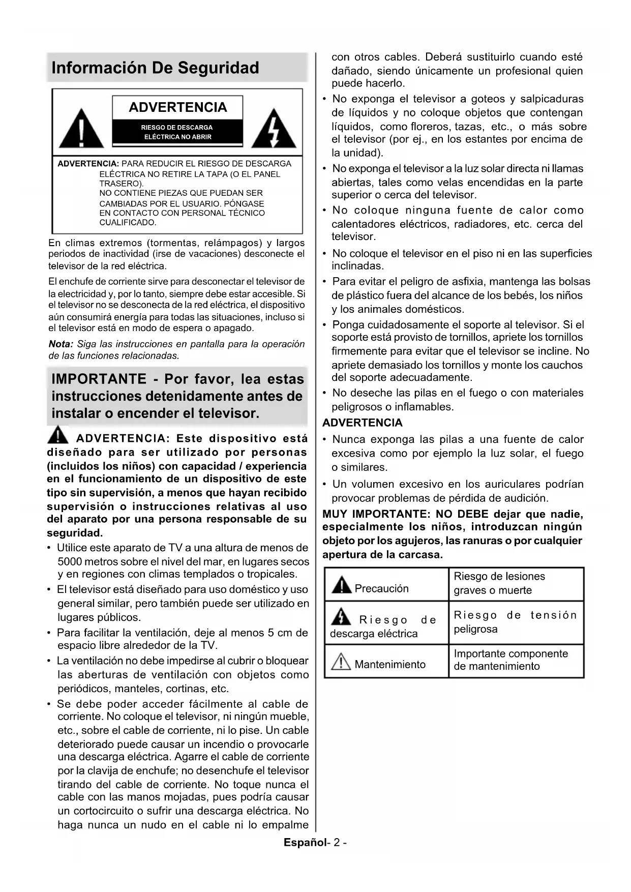 Información sobre su desecho ............................ 36Español- 2 - Información De Seguridad ADVERTENCIA RIESGO DE DESCARGA ELÉCTRICA NO ABRIRADVERTENCIA: PARA REDUCIR EL RIESGO DE DESCARGA ELÉCTRICA NO RETIRE LA TAPA (O EL PANEL TRASERO). NO CONTIENE PIEZAS QUE PUEDAN SER CAMBIADAS POR EL USUARIO. PÓNGASE EN CONTACTO CON PERSONAL TÉCNICO CUALIFICADO.Nota: Siga las instrucciones en pantalla para la operación de las funciones relacionadas.En climas extremos (tormentas, relámpagos) y largos periodos de inactividad (irse de vacaciones) desconecte el televisor de la red eléctrica.El enchufe de corriente sirve para desconectar el televisor de la electricidad y, por lo tanto, siempre debe estar accesible. Si el televisor no se desconecta de la red eléctrica, el dispositivo aún consumirá energía para todas las situaciones, incluso si el televisor está en modo de espera o apagado. IMPORTANTE - Por favor, lea estas instrucciones detenidamente antes de instalar o encender el televisor. ADVERTENCIA: Este dispositivo está diseñado para ser utilizado por personas (incluidos los niños) con capacidad / experiencia en el funcionamiento de un dispositivo de este tipo sin supervisión, a menos que hayan recibido supervisión o instrucciones relativas al uso del aparato por una persona responsable de su seguridad.