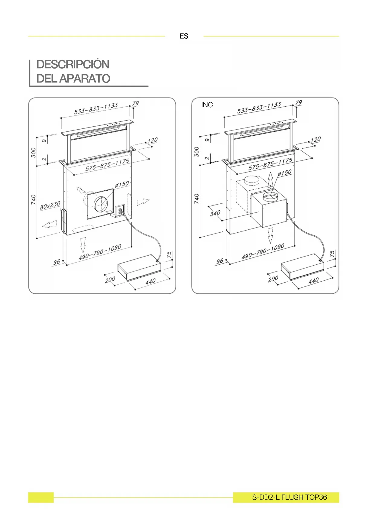 - Noponerlasmanosenelradiodeaccióndel downdraft mientras éste esté en movimiento. Con la intención constante de mejorar nuestros productos, nos reservamos el derecho de apor- tar a sus características técnicas, funcionales o estéticas todas las modificaciones derivadas de su evolución. En el caso de versión esternal mo- tor, para el normal funcionamiento del downdraft es necesario utilizar un grupo aspirante (motor externo) de la misma casa fabricante. El aire extraído no se debe encanalar hacia un conducto usado para la descarga de humos de aparatos alimentados con energía diferente de la eléctrica (instalaciones de calefacción cen- tralizada, etc.). Para la descarga del aire extraí- do, respete las indicaciones de las autoridades competentes. ADVERTENCIA Conservar estas instrucciones de uso jun- to con el aparato. Si el aparato se vende o cede a otras personas, asegurarse de que vaya acompañado de estas instrucciones. Agradecemos que tome nota de estos con- sejos antes de instalar y utilizar el aparato. Han sido redactados para su seguridad per- sonal y la de los demás.S-DD2-L FLUSH TOP 35
