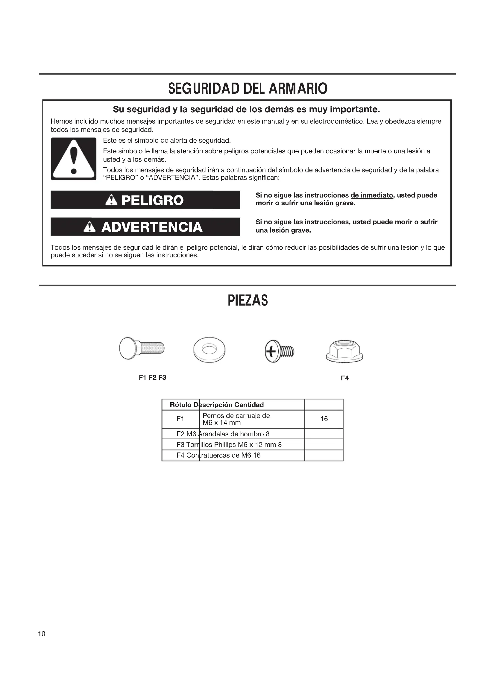 Si no sigue las instrucciones de inmediato, usted puede morir o sufrir una lesión grave. Si no sigue las instrucciones, usted puede morir o sufrir una lesión grave. Todos los mensajes de seguridad le dirán el peligro potencial, le dirán cómo reducir las posibilidades de sufrir una lesión y lo que puede suceder si no se siguen las instrucciones. Su seguridad y la seguridad de los demás es muy importante. Hemos incluido muchos mensajes importantes de seguridad en este manual y en su electrodoméstico. Lea y obedezca siempre todos los mensajes de seguridad. ADVERTENCIA PELIGRO Este es el símbolo de alerta de seguridad. Este símbolo le llama la atención sobre peligros potenciales que pueden ocasionar la muerte o una lesión a usted y a los demás. Todos los mensajes de seguridad irán a continuación del símbolo de advertencia de seguridad y de la palabra “PELIGRO” o “ADVERTENCIA”. Estas palabras significan: PIEZAS F1 F2 F3 Rótulo Descripción Cantidad